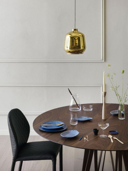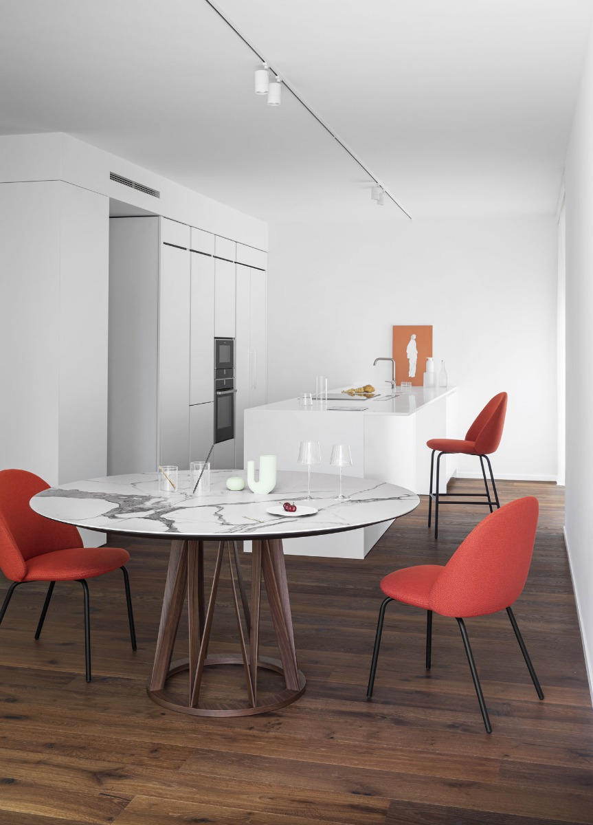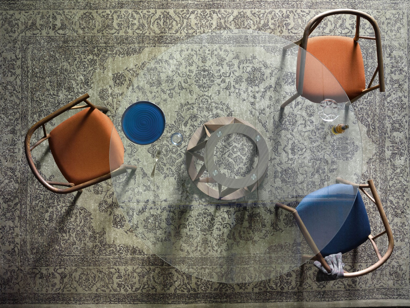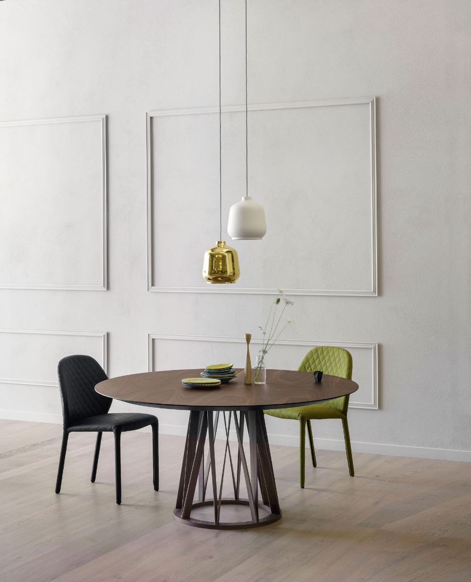 Acco is an elegant dining table with a strong character that does not want to be labelled. The base is made entirely of wood while the top is available in transparent glass, wood, or ceramic, round or oval shape.