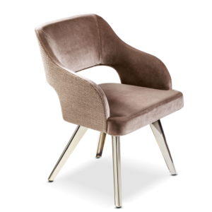 The Adria padded chair, with its generous dimensions, is ergonomically designed to offer maximum comfort . It can also be used as an armchair. The stems are made in laser-cut and curved metal. The profiled seat and backrest are covered in fabric, velvet, leather or with any customized cover.
