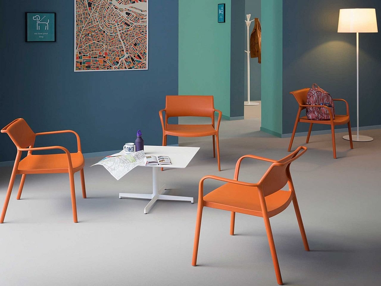 Lounge seating, a natural extension of the armchair in polypropylene moulded reinforced with glass fibres, is suitable for both indoors and outdoors. The upper part of back structure forms a big handle for an easy lifting and moving, giving it a distinct character. Thanks to the tapered shape of the legs it’s light and elegant, although resistant and non-deformable. Stackable max n° 8 pieces.