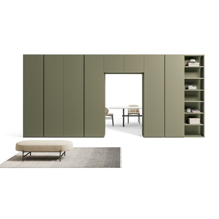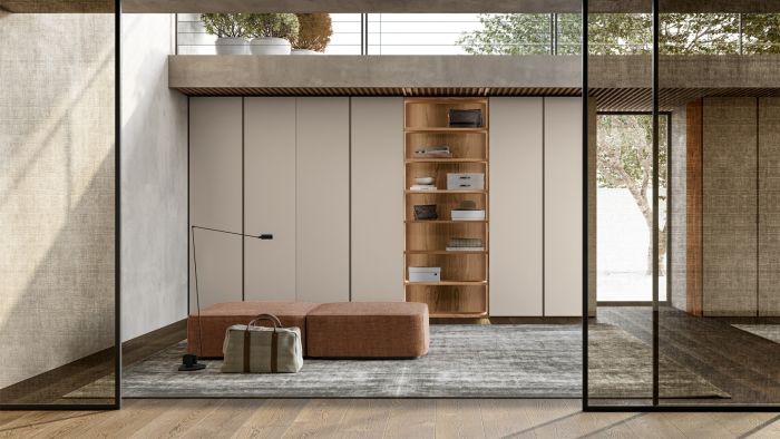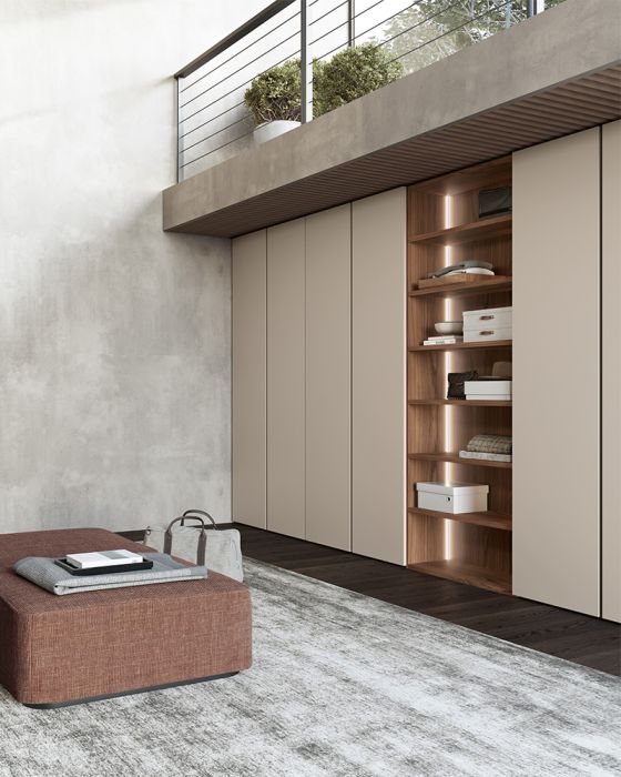 You can customize your Tecno hinged-door wardrobe as you wish. In the images, for example, there is a composition dedicated to functionality. It is equipped with open modules, LED lighting, and internal drawer units.