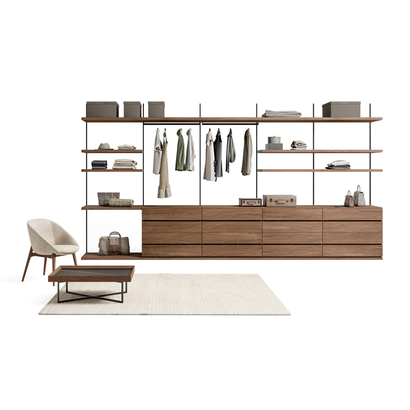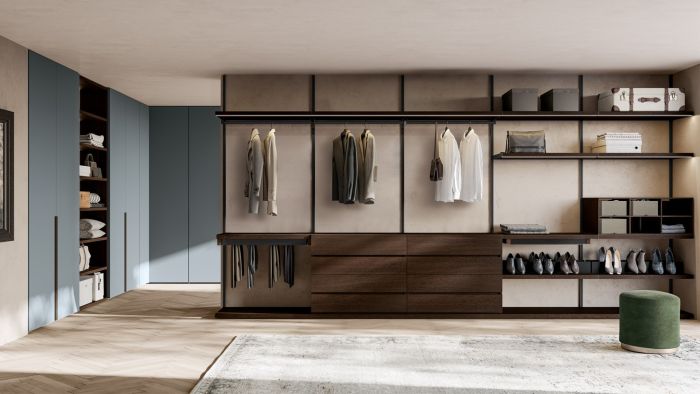 The aesthetics of Easy stand out for their clean lines and the ability to customize interiors with a wide range of accessories: from shelves and drawers to clothes rails. It is the ideal choice for those who want a modern, discreet walk-in closet capable of enhancing the bedroom area, ensuring easy and intuitive access to all your garments and accessories.