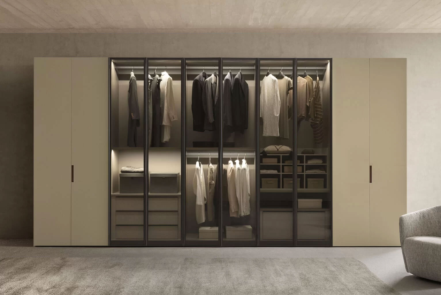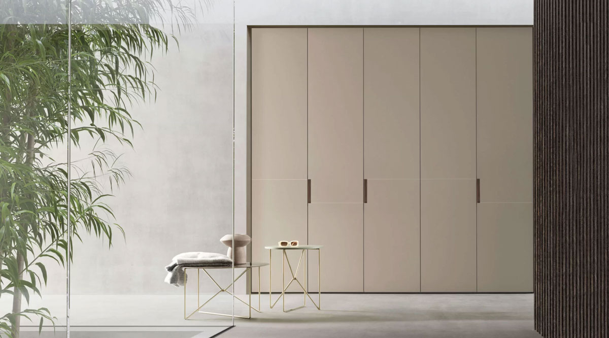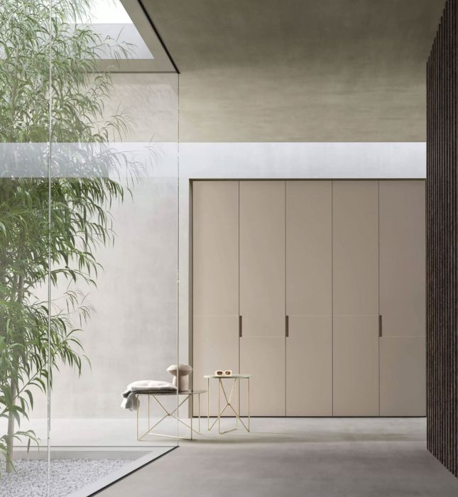 Wardrobe with a hinged door, characterised by a special 5 mm thick hollow insert, either horizontal or vertical, which decorates the surface and acts as a handle at the same time. A practical grip that can be customised in different finishes, contrasting or matching the door.