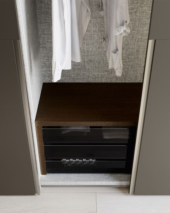 Attention to detail and rich modularity make Green an extremely versatile system. The ability to play with different finishes – from wood essences to lacquered colors – allows you to customize the wardrobe according to your personal style, always ensuring a high visual impact. A piece that transforms the sleeping area into an organized, welcoming, and characterful space.
