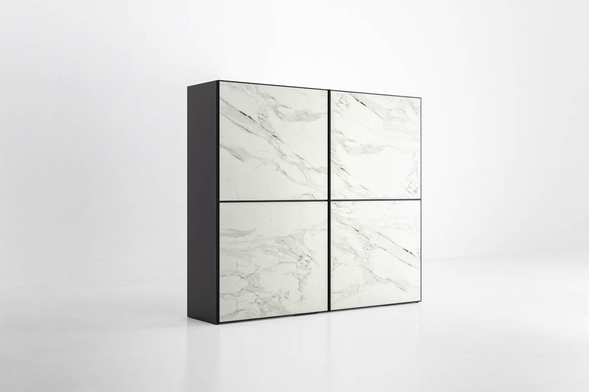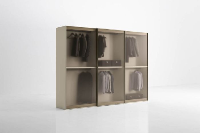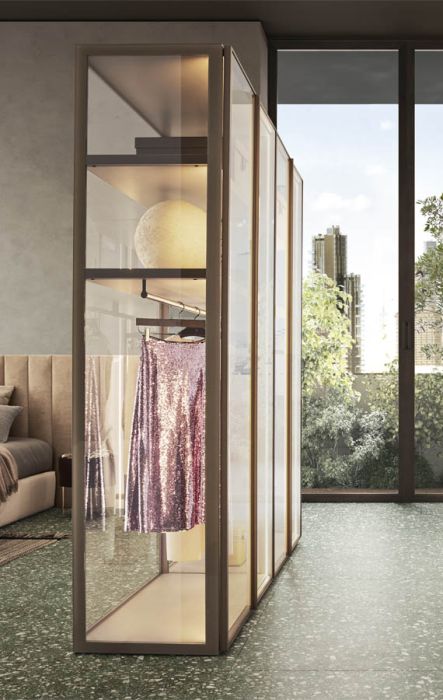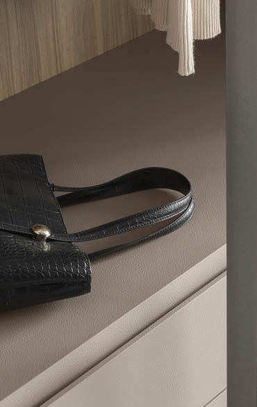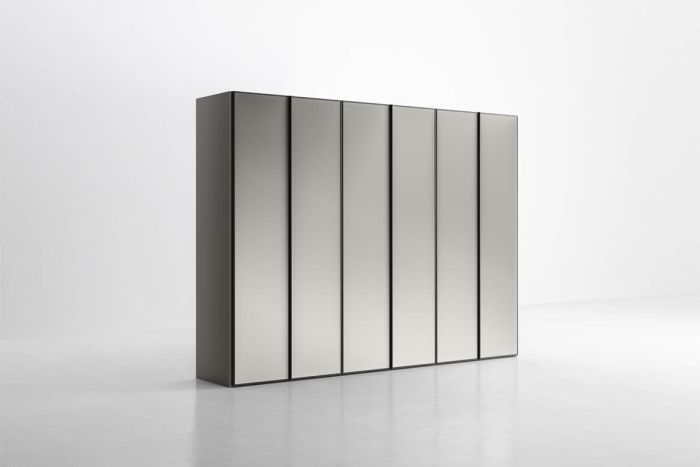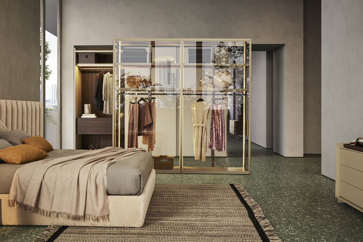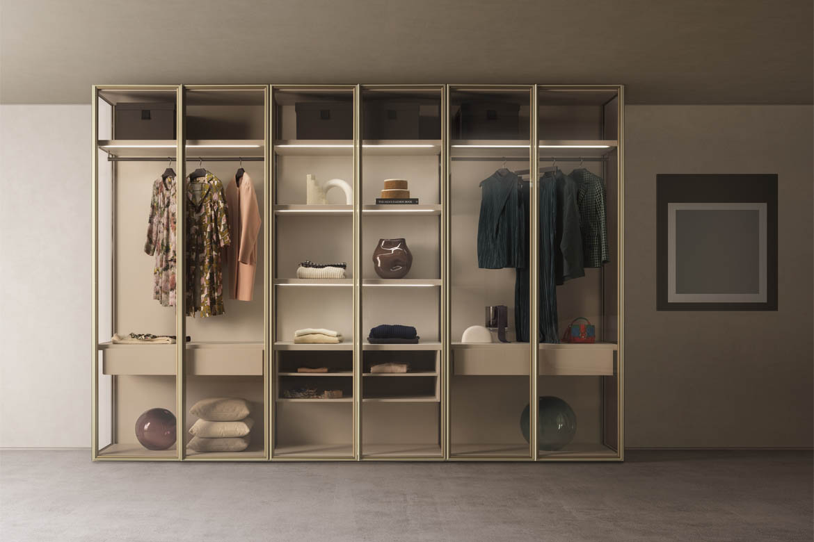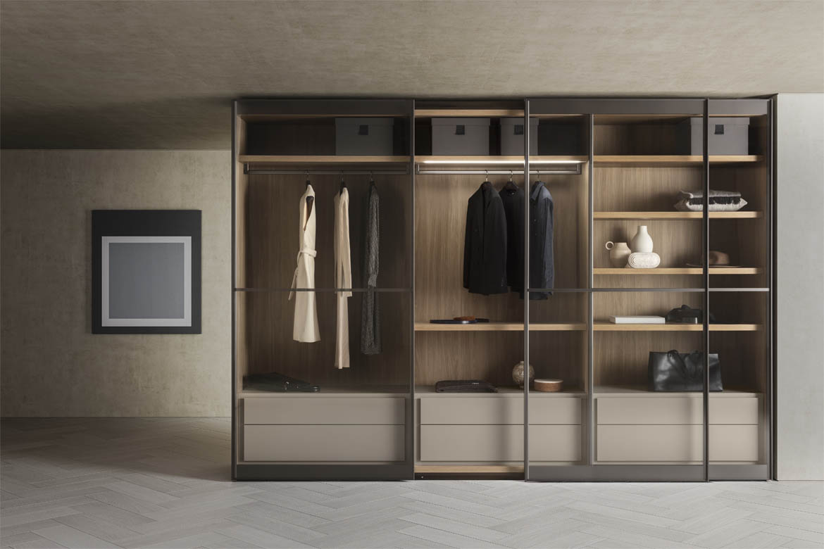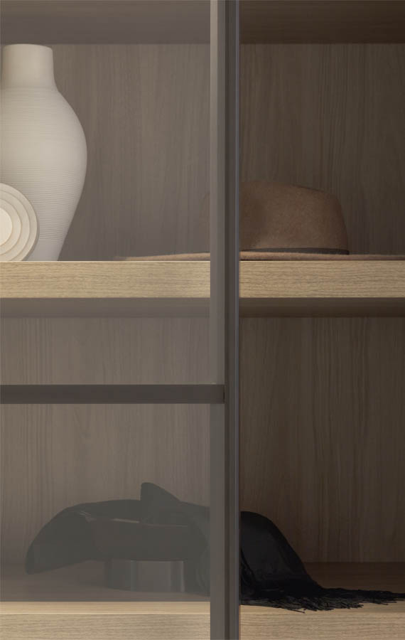 Flowing surfaces, as simple as the material they are made of. The perimeter frame is designed to resemble the frame of a work of art: the “bevelled” section provides a discreet yet elegant frame. The doors, available in several glass finishes, reveal the contents with an elegant, fresh style. In the sliding and flush sliding versions, they feature a horizontal profile to match the frame, available in Palladio and Canna di Fucile finishes: a delicate, refined detail that highlights the surfaces and accentuates the structure.