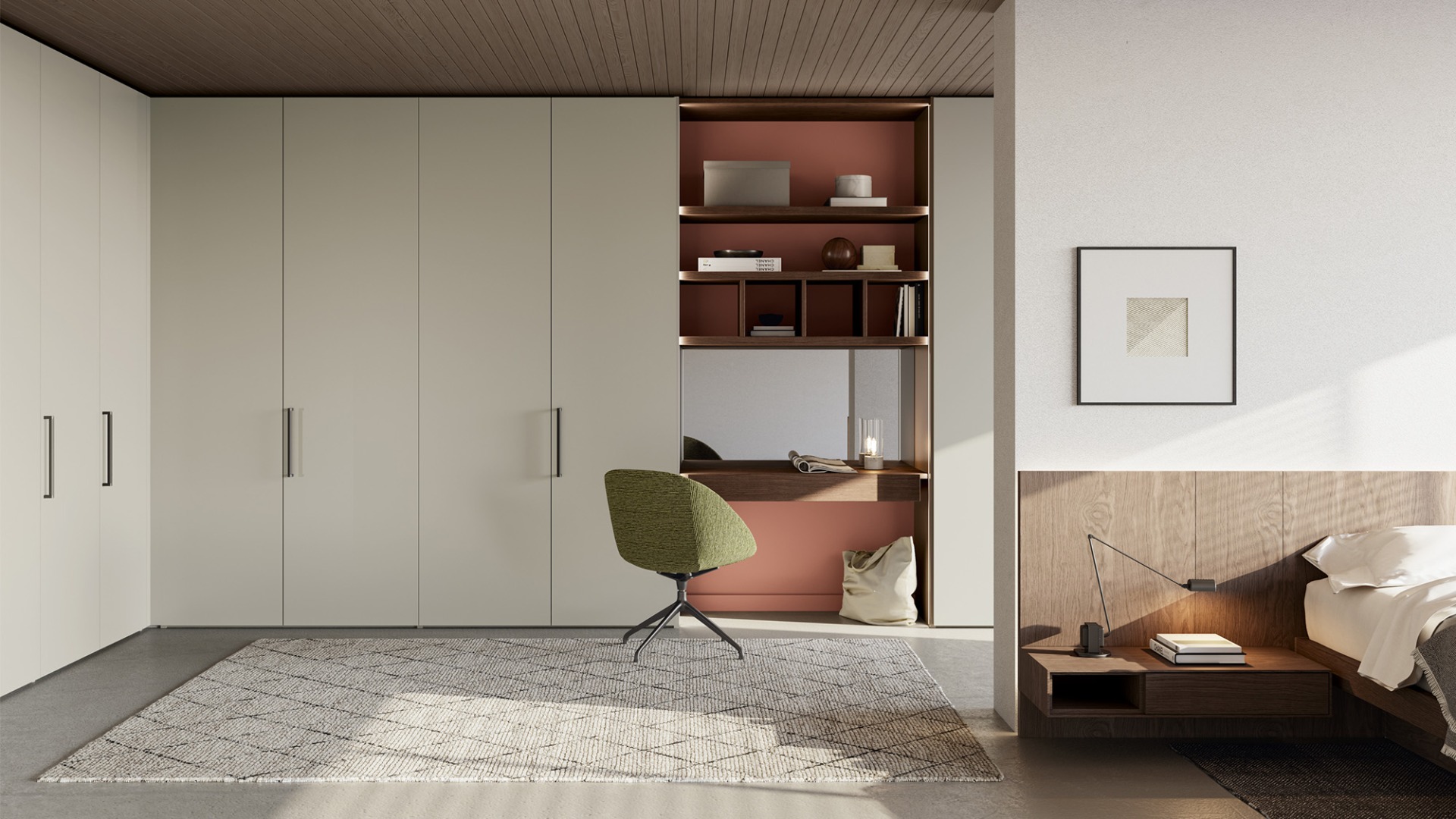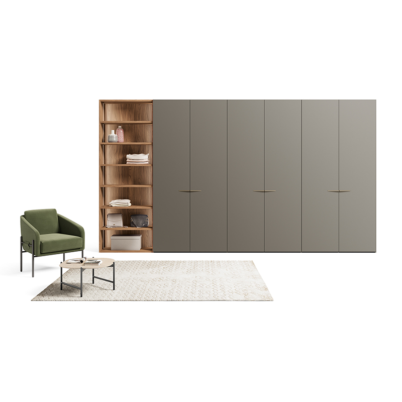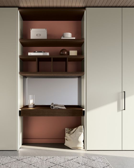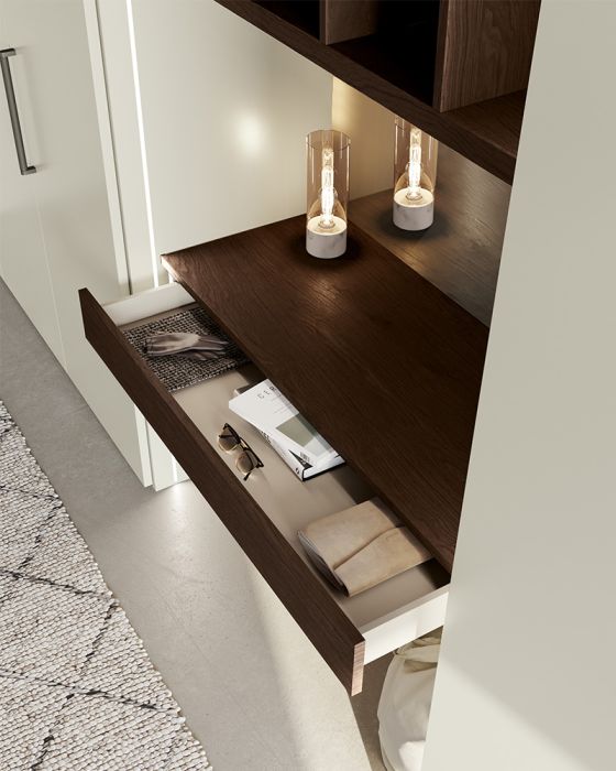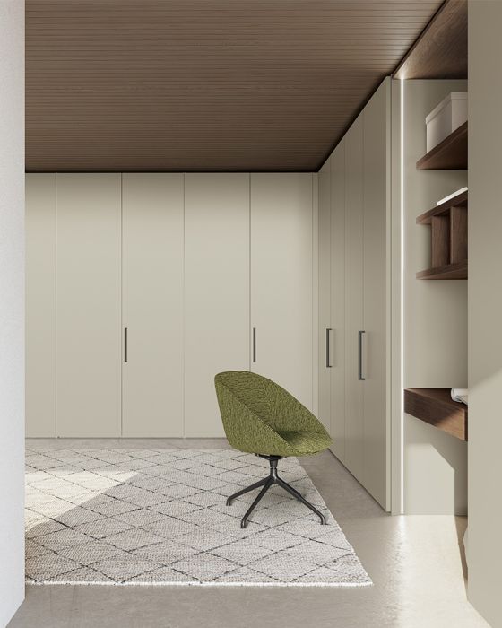 Simply can be customized with the addition of a vanity corner, transforming the bedroom into a multifunctional space. An intelligent design that incorporates a discreet vanity with a mirror, creating a dedicated place for beauty and personal care routines. The vanity corner is designed to integrate perfectly with the wardrobe's design, maintaining a consistent and refined aesthetic.