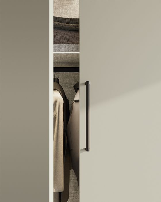 The linearity of the Simply hinged door is an opportunity to highlight every available detail: the numerous handles, including key locks, finishes in wood essence and in matte, glossy, and special lacquers with metal or concrete effects, and the various modules, including internal and external corner units. In the images, the linear Simply door in silk grey matte lacquer finish is paired with the M03 black metal handle.