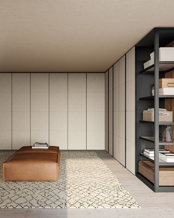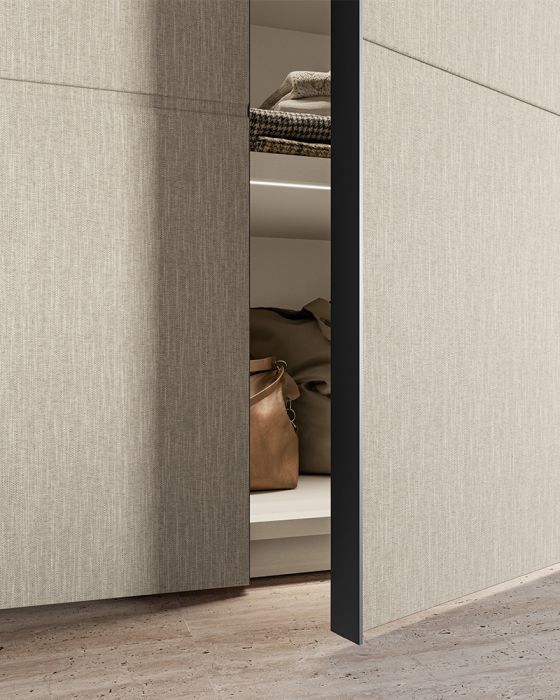 The strength of the Tela model lies in its extreme versatility: the handle profile can be customized in a wide range of colors, allowing for tone-on-tone combinations for a minimal look or bold contrasts for a more contemporary character. The wardrobe is available in various finishes, from matte and glossy lacquers to wood essences, ensuring a perfect fit for any bedroom environment.