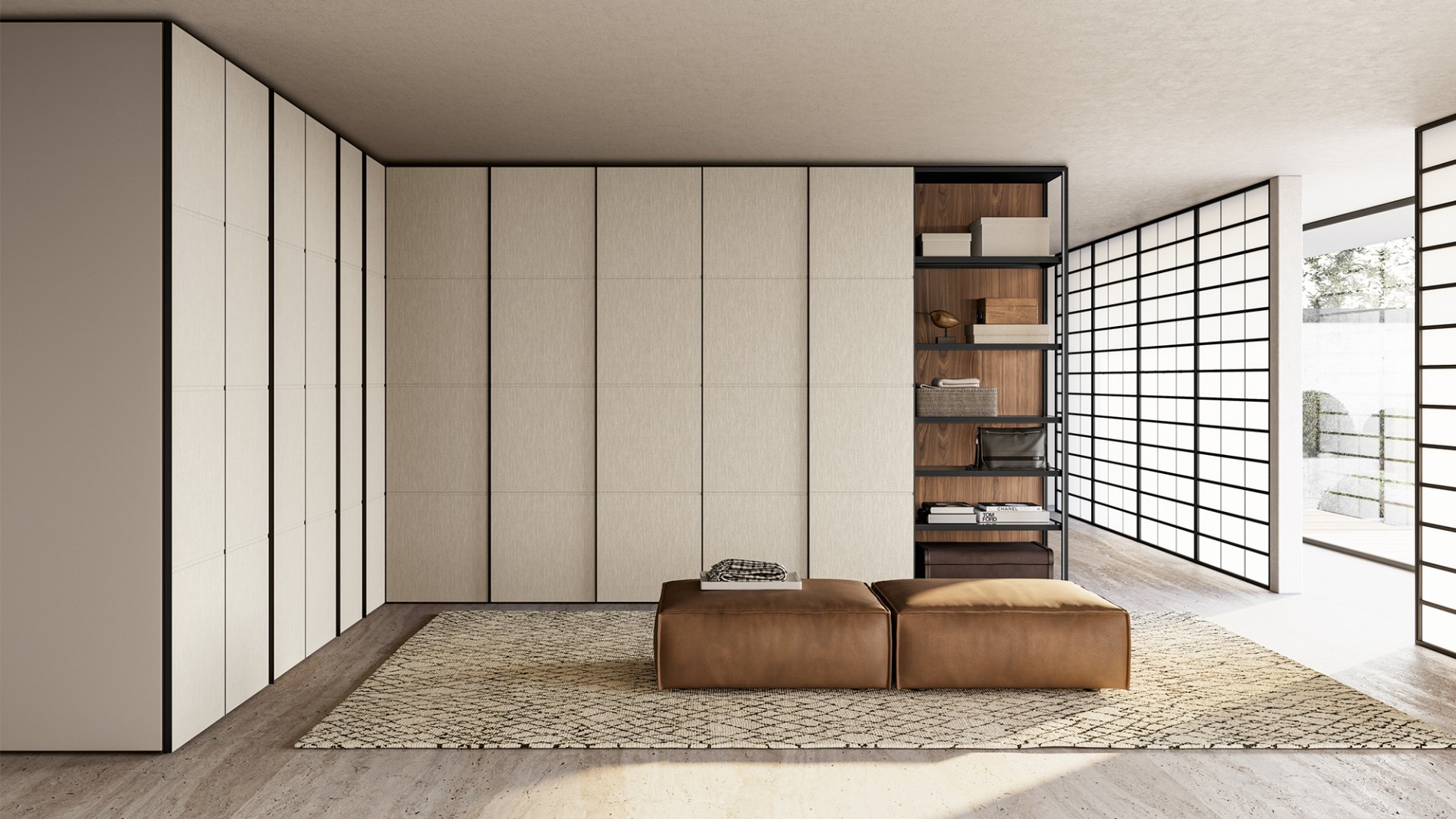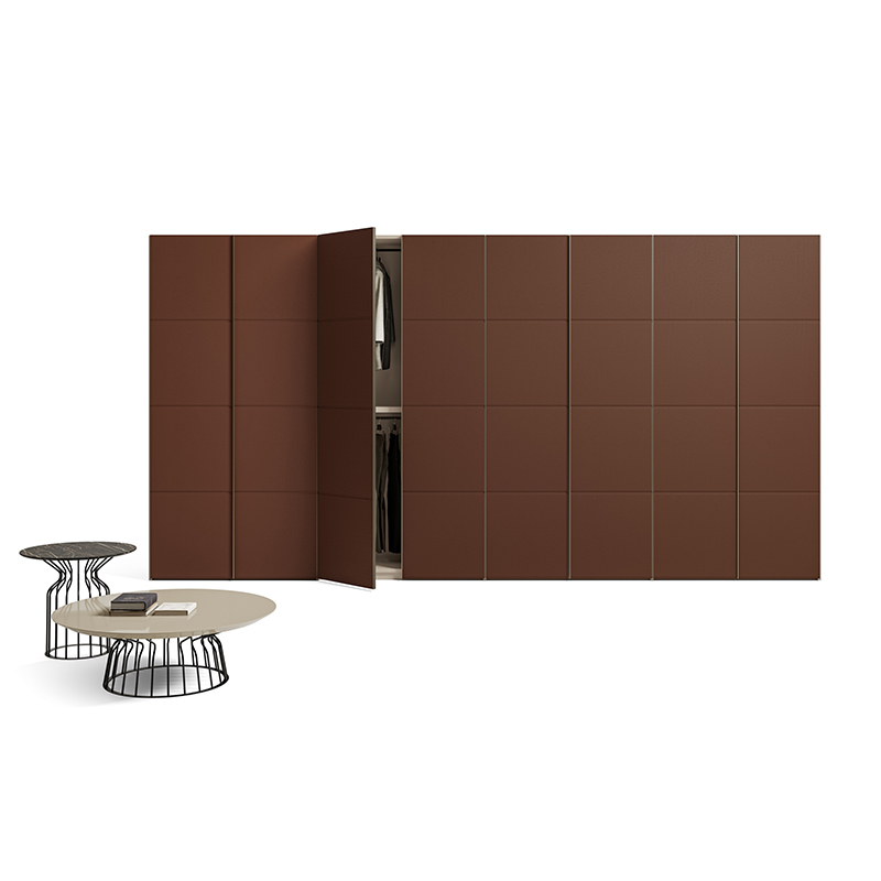 The Tela hinged-door wardrobe is a distinctive design solution characterized by a vertical painted metal profile that acts as a handle. This graphic element not only provides a practical grip but also defines the aesthetics of the door, creating a sophisticated play of lines and proportions.