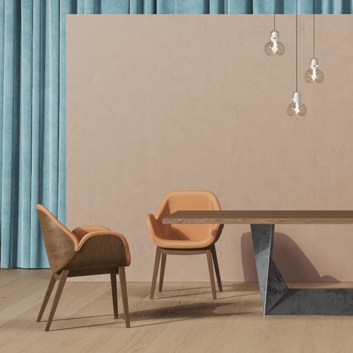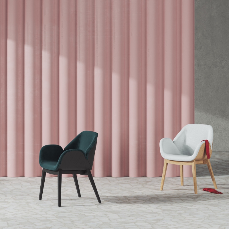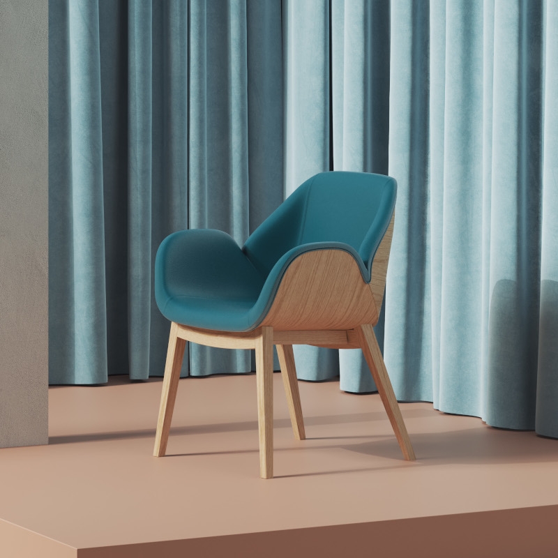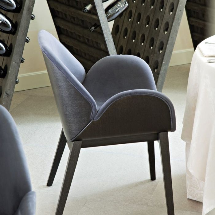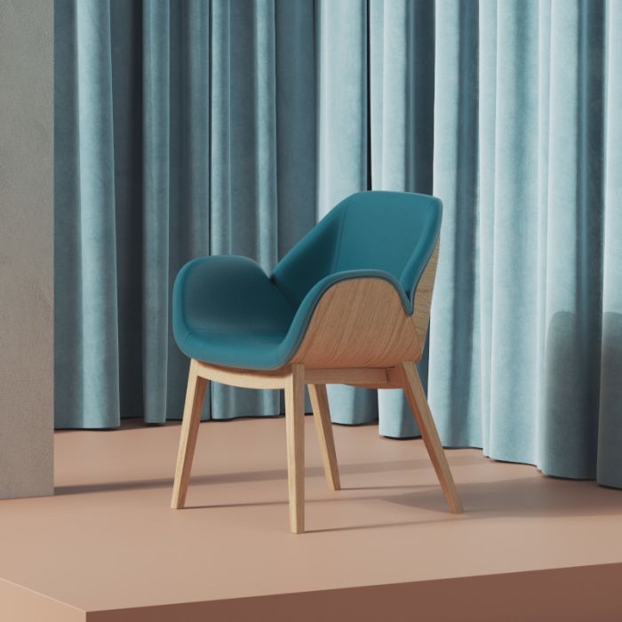 Armchair with ash legs. Seat in curved ash, upholstered, coverings from the collection. Visible rear casing in various ash colors.