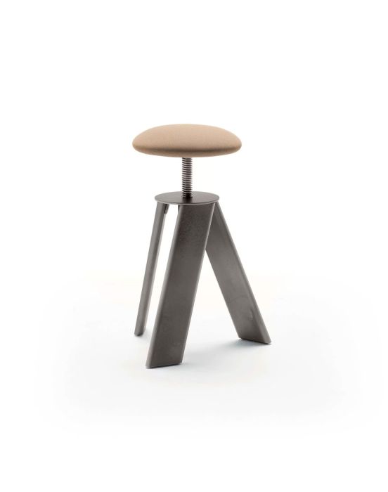 A practical stool design that is height adjustable by means of an endless screw in the frame.