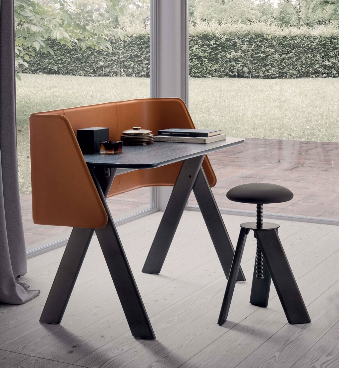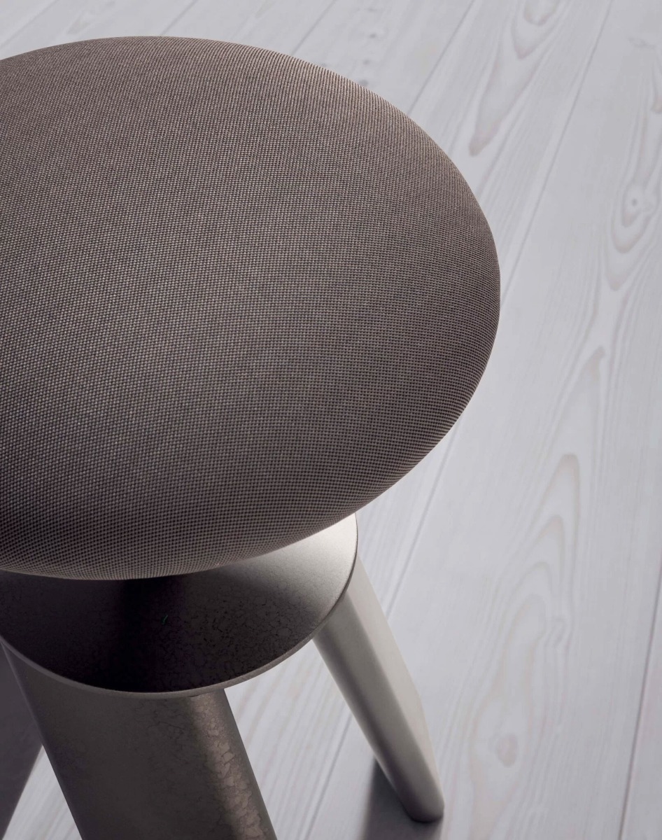 It has a customisable round seat in soft fabric, fine leather or faux leather with non-removable covers.