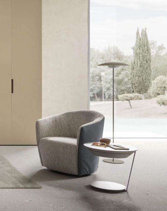 A design that looks like a full stop, a round coffee table with a lateral leg that can be used as a side table, drawing a dot on the surface it stands next to.