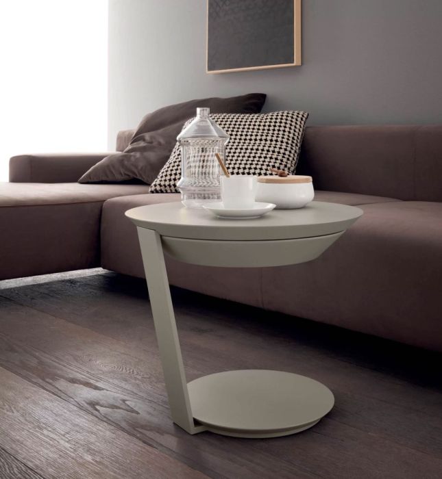 Rounded bevelled circular top in matt or gloss lacquered finish, available with a swivel drawer opening to the left or right.