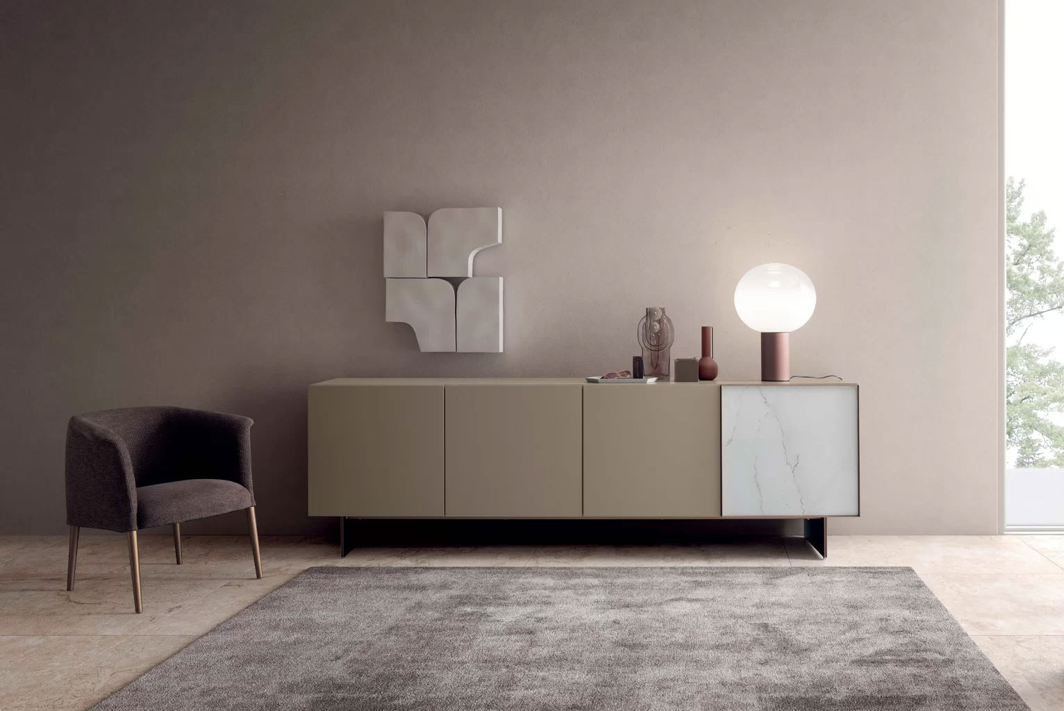 20-mm thick structure and fronts made from lacquered particleboard. Fronts feature a 3-mm thick lacquered metal frame and a customised inner panel available in lacquer, veneer, lacquered glass, stone or ceramic.