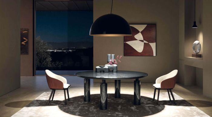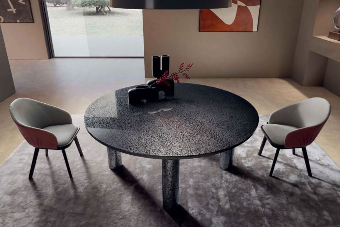 An extremely dynamic, round table whose high-impact design is also expressed in the apparent contrast between the solid stability of its base and the void between its two parts.