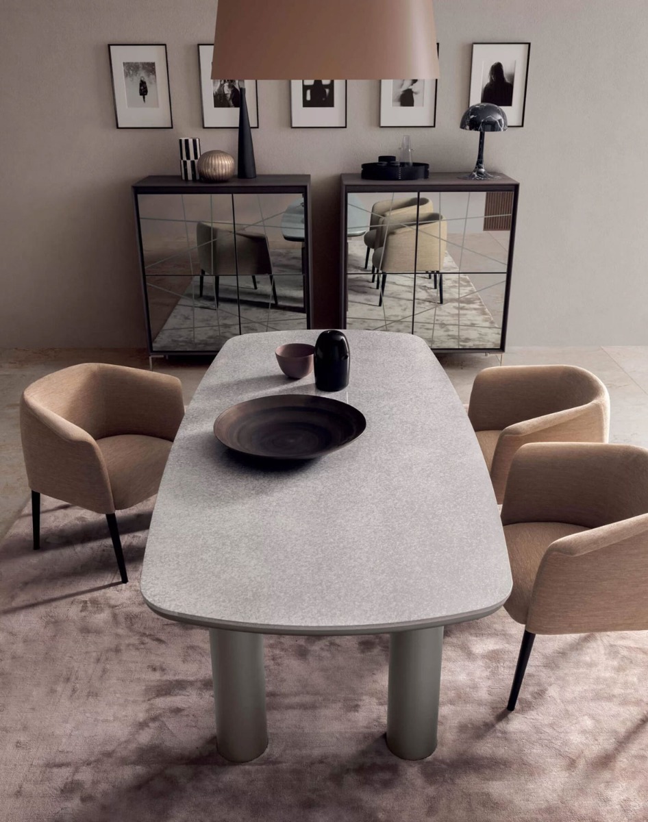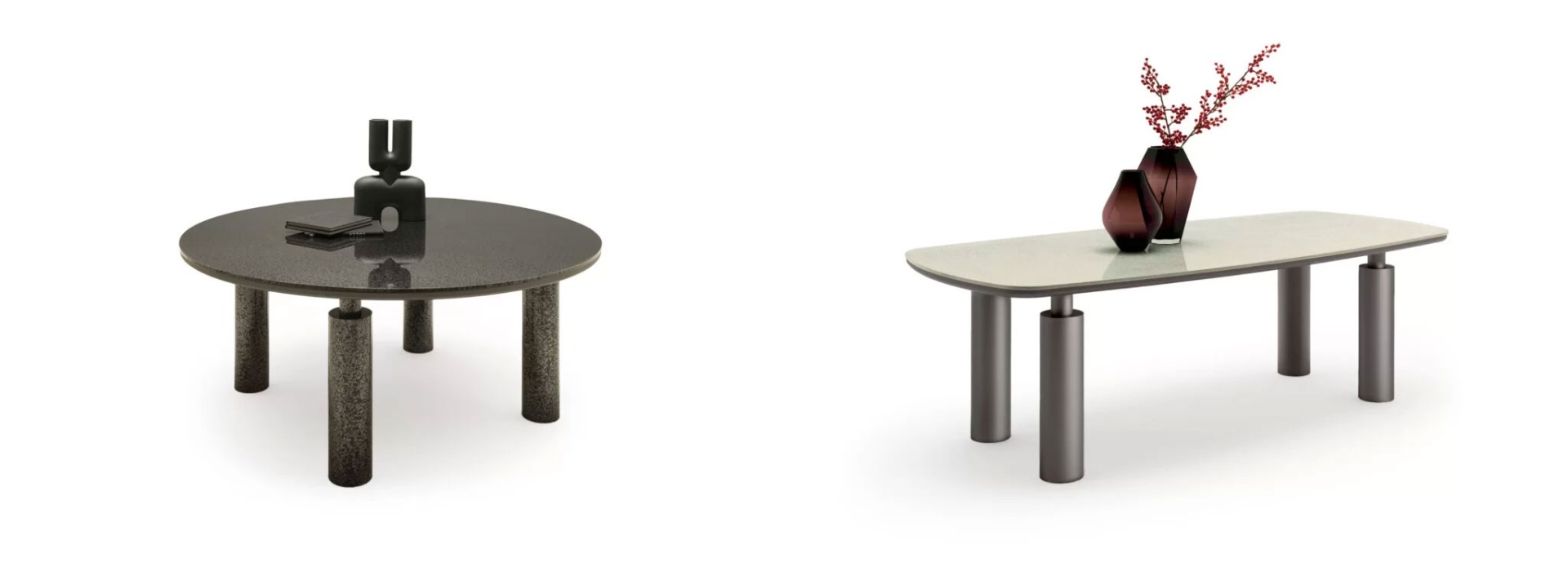 The structure consists of a top (variable thickness depending on the chosen finish) and under-top (30 mm thick), both customisable in different finishes, and cylindrical legs (160 mm thick) in a matt Black lacquer, Metal Standard or polished marble-effect finish.