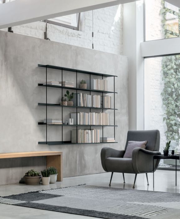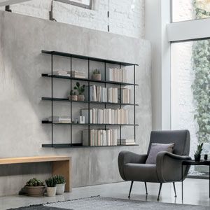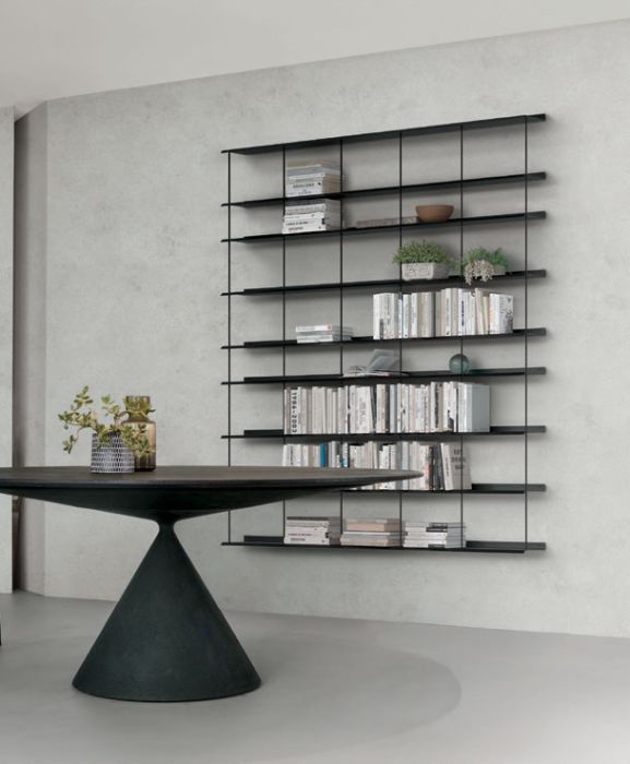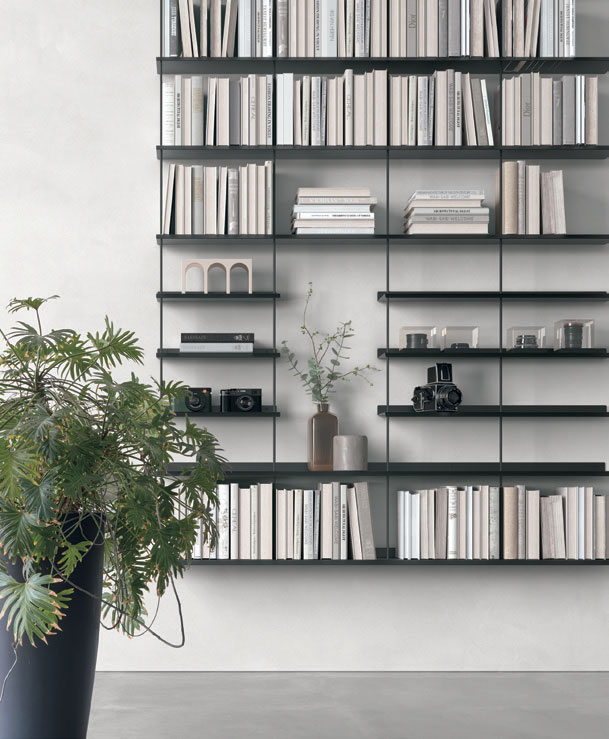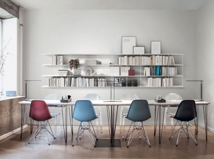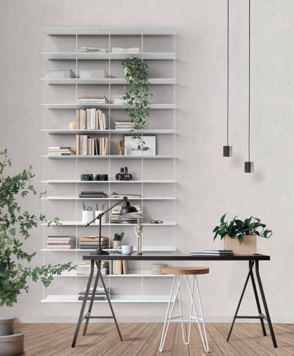 In a vertical or horizontal configuration, the office is the ideal place for the bookcase to show off all its practicality. Thanks to its tubular rod structure with slim shelves, All-Over has a visually light appearance, even when it is large: it’s never overwhelming yet always stunning.