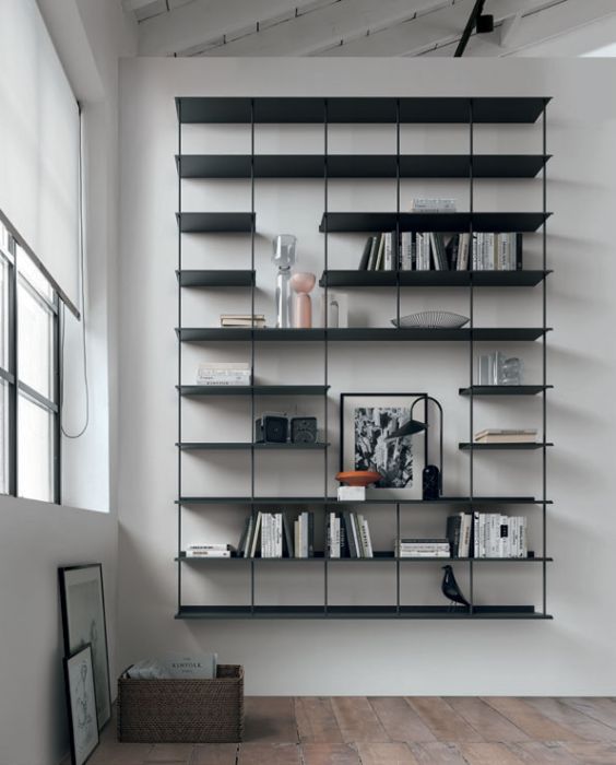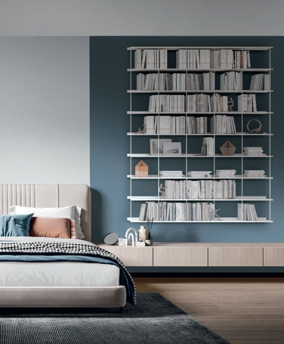 Installing a bookcase in the bedroom is always an excellent idea. Suitable for large or small spaces, All-Over can adapt to any type of wall where it can take on the regular shape of a traditional bookcase or the appearance of an accessory made up of original geometric shapes. By day and by night.