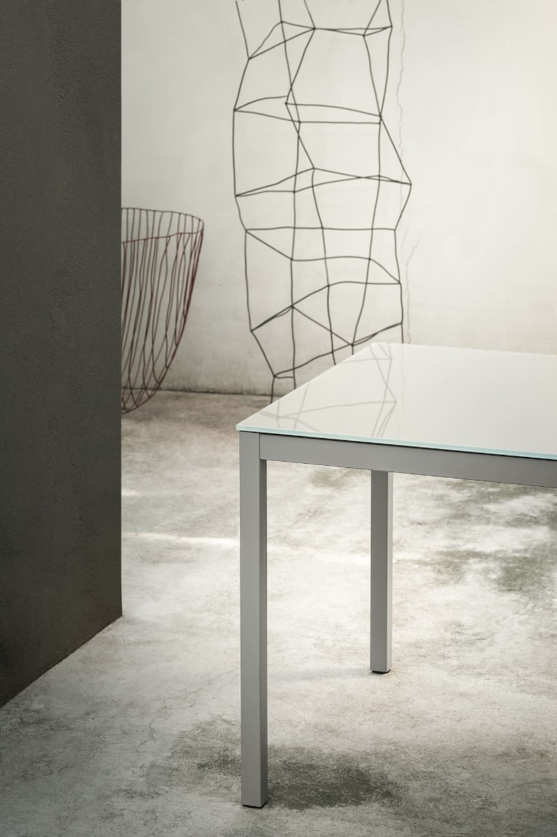 Fixed table with lacquered steel frame. Top in melamine, scratch-resistant unicolor, glass, and scratch-resistant glass.