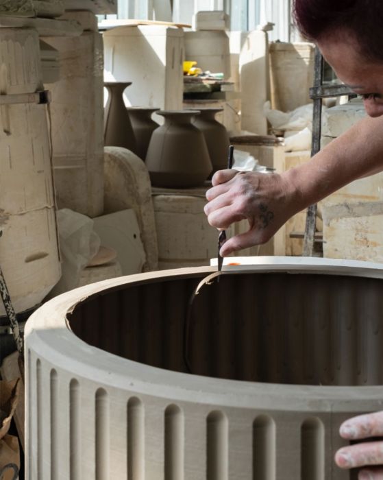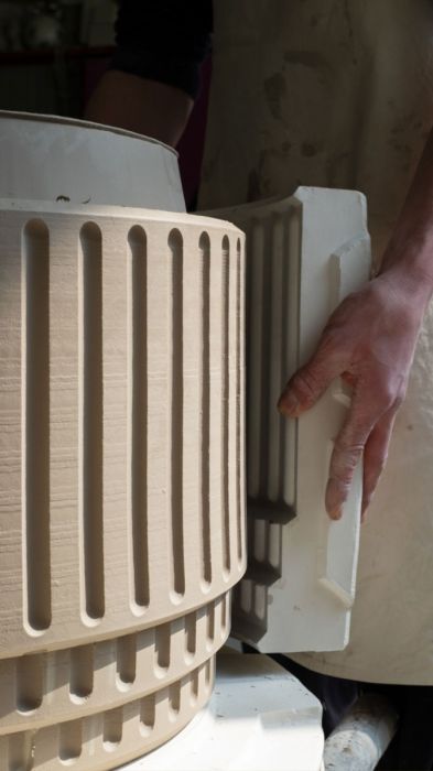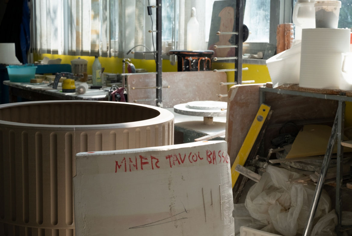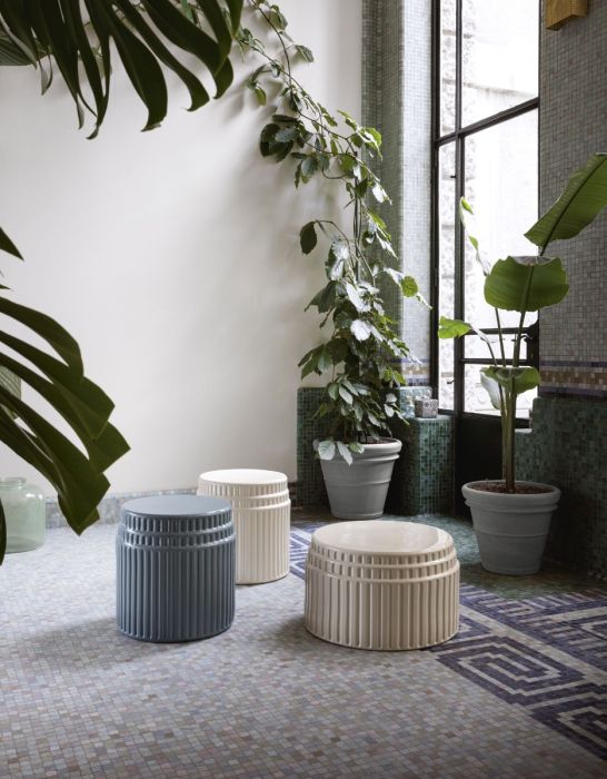 Kolos is formed in a plaster mould in a pottery where craftsmen apply the glaze and then fire the table. Although shiny and polished to the touch, the material it is made of is evident. The corners absorb less colour and become paler while the pigments are concentrated in the rounded areas, making them darker. Kolos therefore forms a highly decorative side table, combining its function as a furnishing accessory with an artistic value to form a showpiece. Its eccentric aesthetic represents an ironic interpretation of the architecture of the Colosseum. Coffee and side-table set in matt or glazed ceramic.