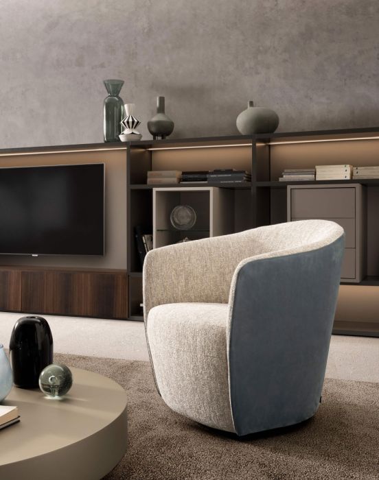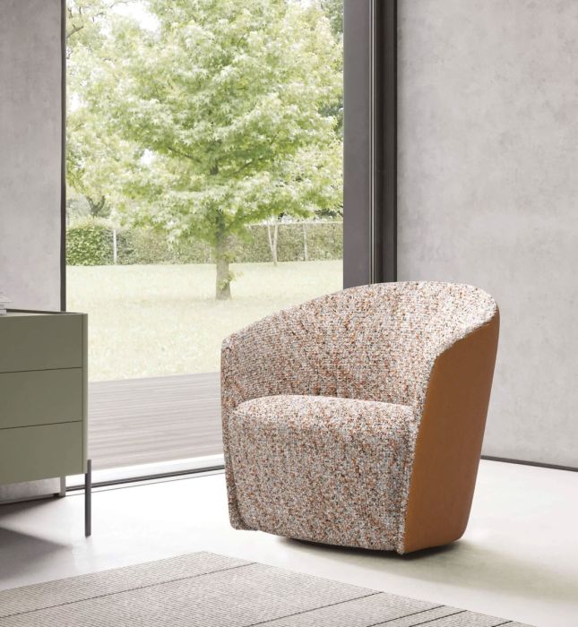 The armchair has an integrated base that allows it to rotate. Upholstery in non-removable fabric or leather, also available with contrasting backrest.