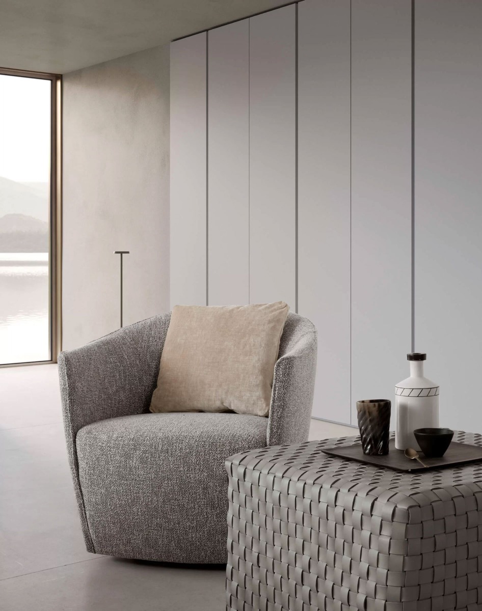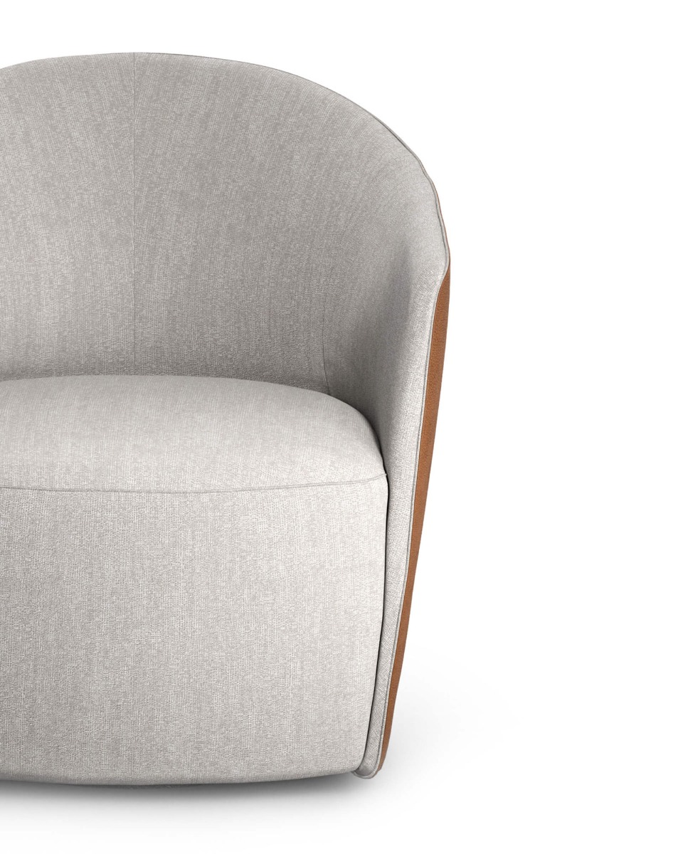 Cosy and inviting, its curvy shape wraps around the seat. Its compact volume and moderate size make it easy to fit into various contexts, thanks also to its base that allows the seat to be simply and effortlessly rotated.