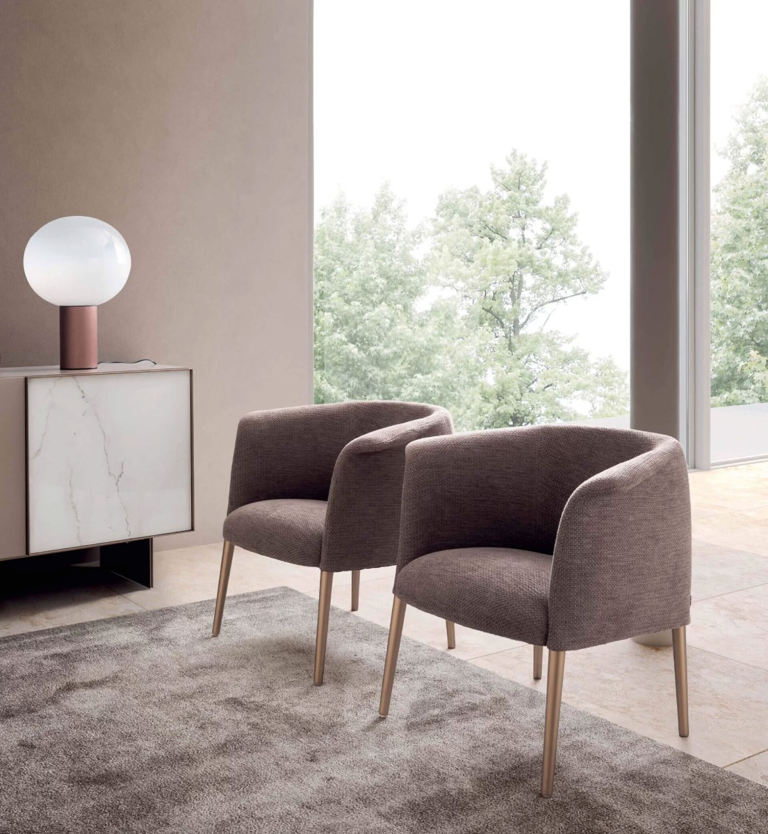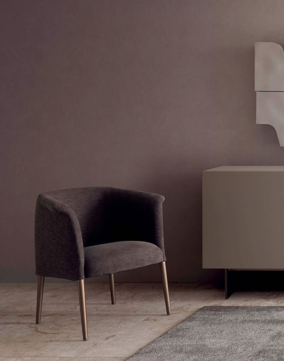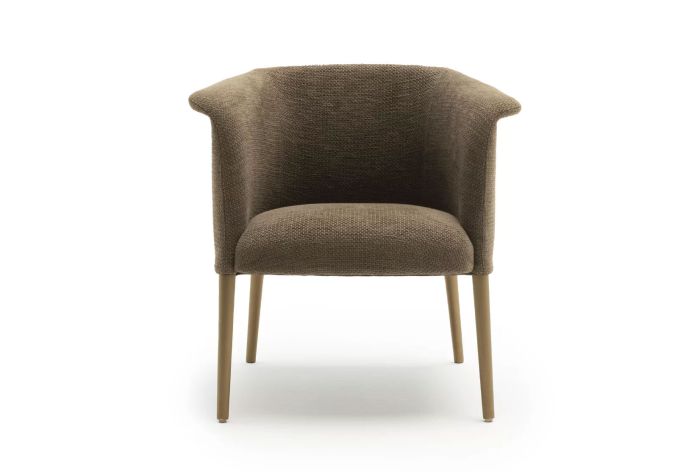 Cosy and inviting, its curvy shape wraps around the seat. Its compact volume and moderate size make it easy to fit into various contexts, thanks also to its base that allows the seat to be simply and effortlessly rotated.