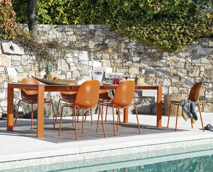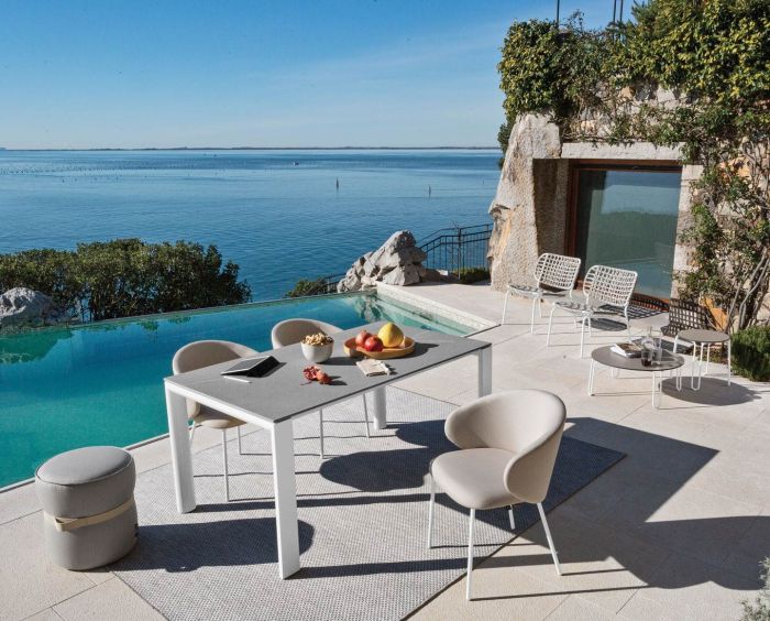 If you are looking for a practical solution for outdoors as well, the extendable DORIAN table is just what you need. It has an aluminium base which has been treated and coated for outdoor use. You can choose between an HPL top or a ceramic top enhanced with In-side technology. The latter has a tactile marled finish reminiscent of natural stones to create an unbroken effect between the surface and the edge. All Dorian surfaces are easy to clean and do not require maintenance despite the passage of time. The ceramic surface has been specially designed to prevent mould and mildew from growing. The 2 extension leaves that allow to increase Dorian's length have been made from HPL.
