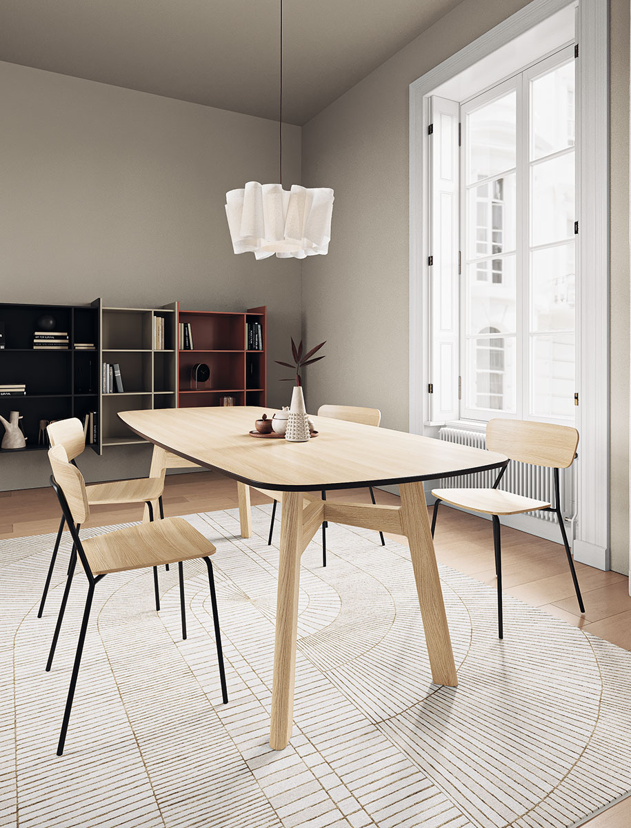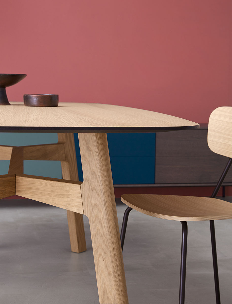 Elegant and sinuous table with solid wood structure. The top is in CDF (Compact Density Fiber) and is available in Laminate, Exclusive (Polaris) and Tranciato (wood).