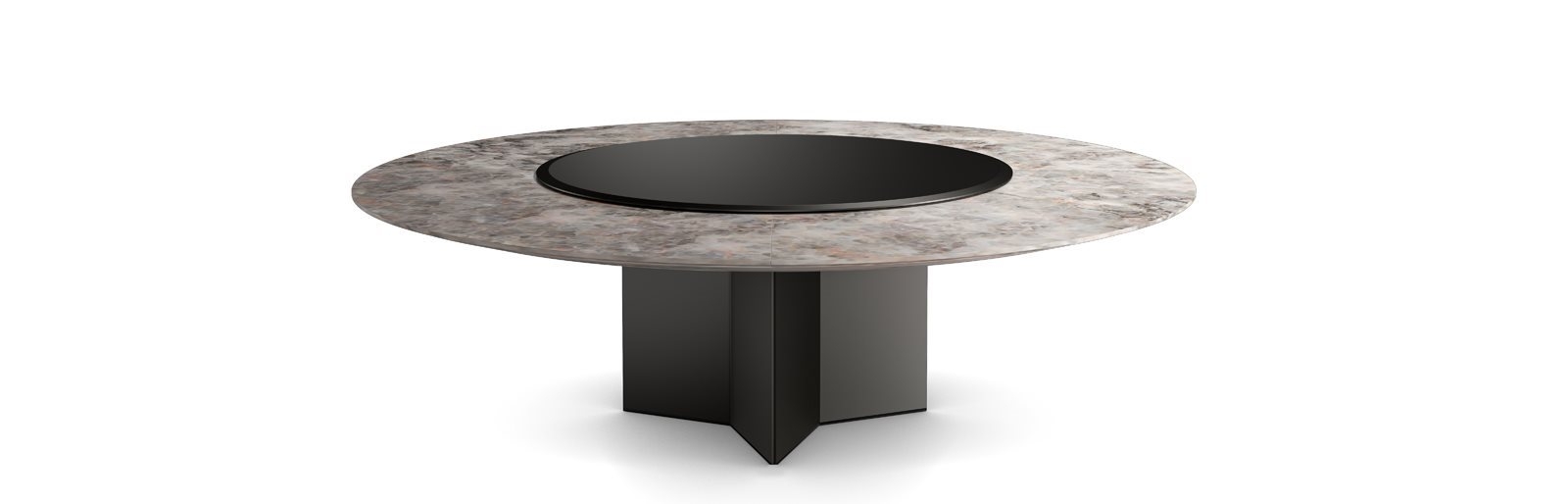 Table with wooden or marble top divided into four sections and 10mm semi-recessed rotating tempered glass plate with 35mm bevel. Wooden base covered by 6mm tempered glass.
