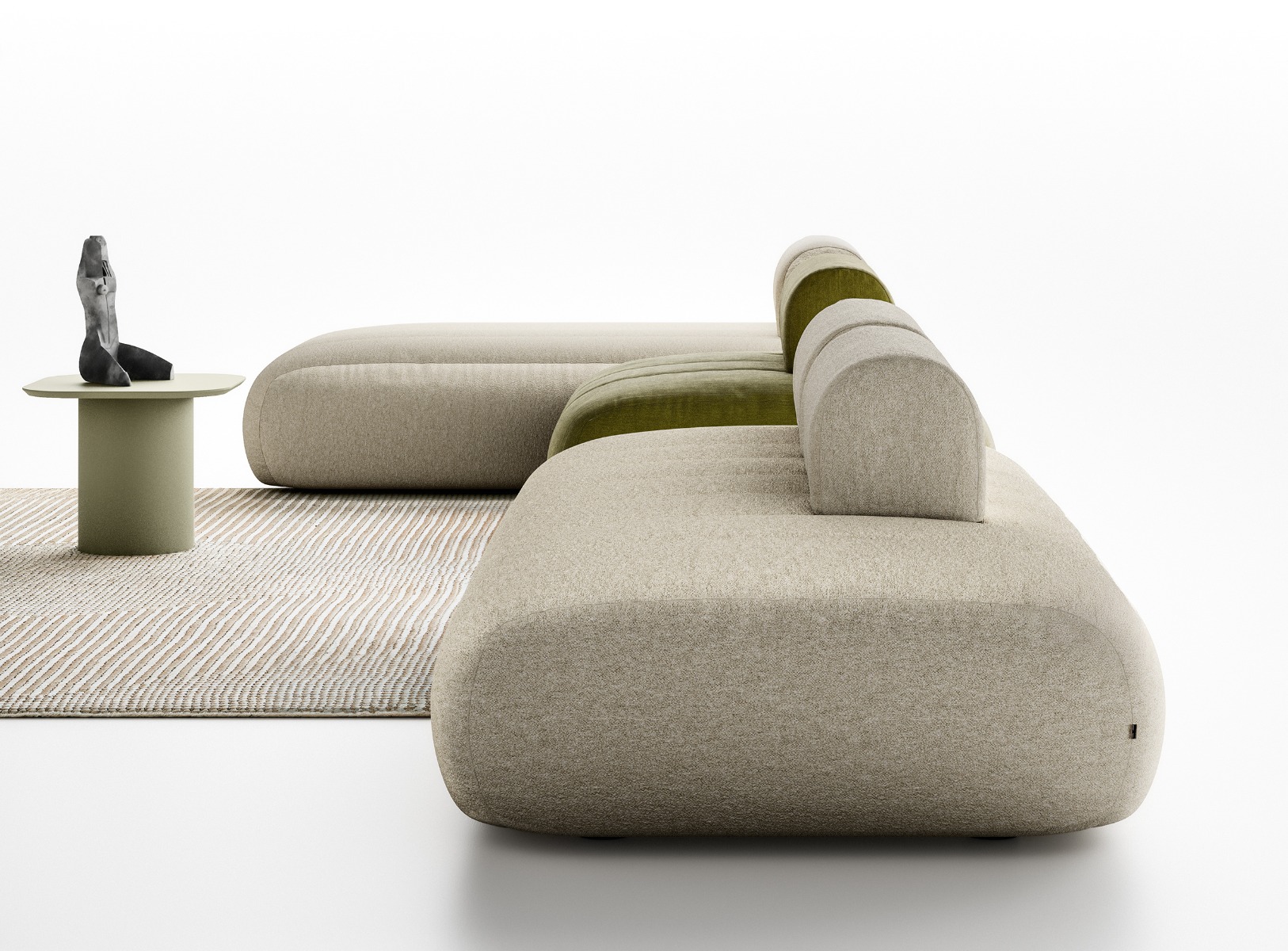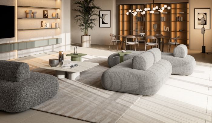 Raggio represents a new approach to the sofa concept, where the softness of lines meets unprecedented compositional freedom. The defining feature is the innovative backrest system: thanks to balanced internal weights, they ensure stable and comfortable support in any position, breaking free from the rigidity of traditional models.