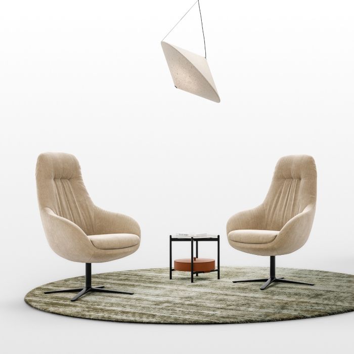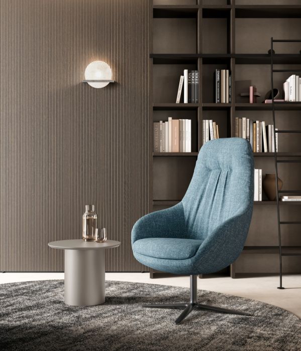 The swivel base in black painted metal, designed to ensure fluid and stable rotation, makes Flo dynamic and practical for daily use. Thanks to the attention to materials and the quality of the swivel mechanism, Flo is a versatile piece, ideal for elegantly and functionally furnishing modern relaxation areas and designer spaces.