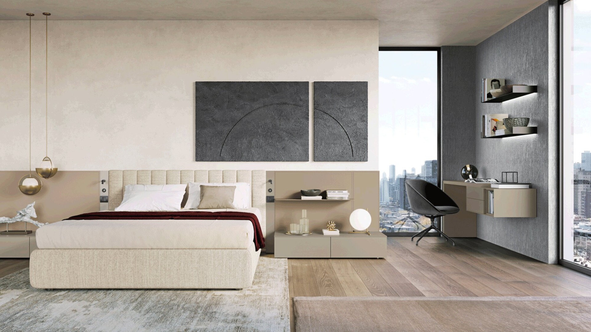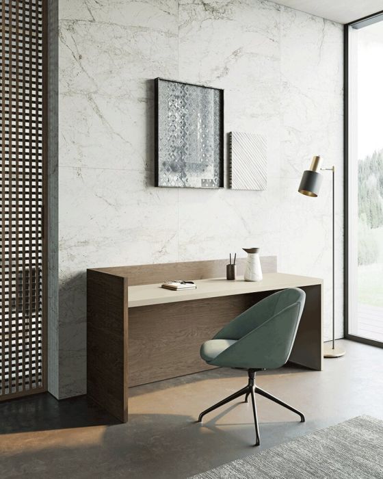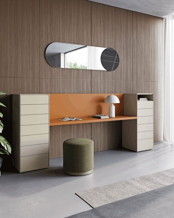 The project is based on the combination of desk tops, vertical support panels, metal shelves, and storage modules from the Slim or Kompos series. Design freedom is absolute: the top can rest on dedicated legs, on base units with drawers or deep drawers, or be integrated into larger wall systems. Dall'Agnese's extensive material library, which includes textured finishes, wood essences, and lacquers, allows for playing with contrasts or creating monochromatic solutions of great formal rigor, making Modula an element capable of naturally adapting to both the living area and the bedroom.