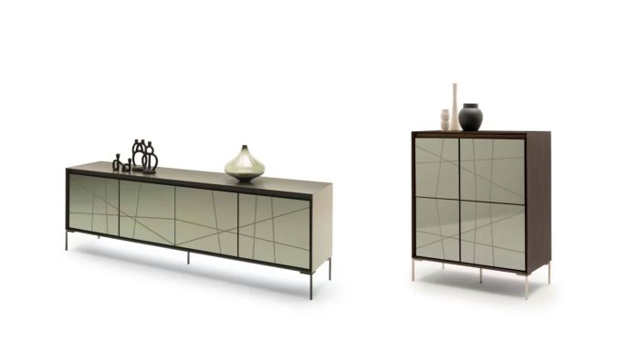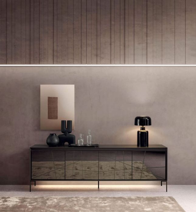 Sideboard with matt lacquered structure or wood finish embellished with fronts in the same finish or customisable in Metal Standard or Vitrum mirror enriched with graphic signs. The horizontal or vertical extension of the sideboard accommodates storage requirements. The sideboard is opened by means of a modern groove grip or, for the bottom drawers, with a push-pull system.