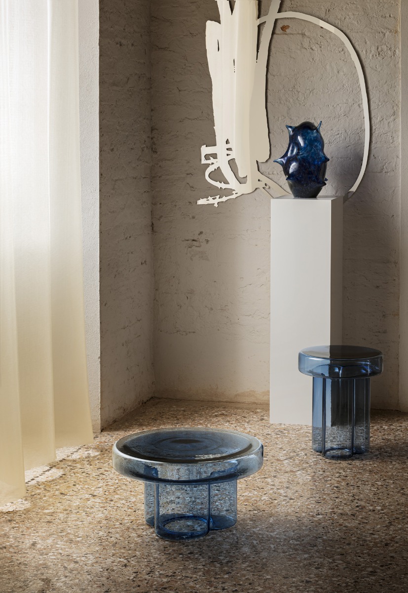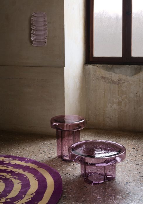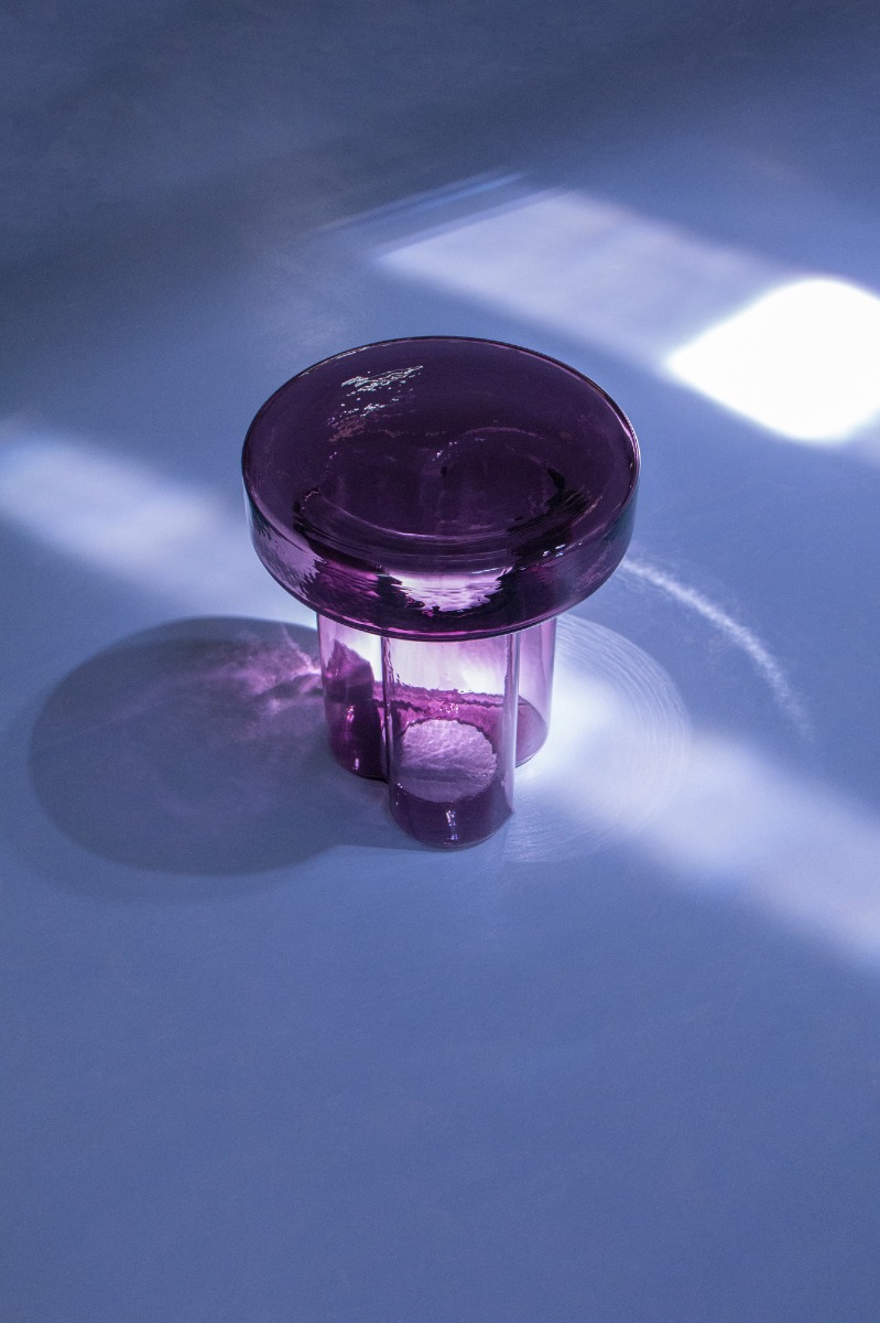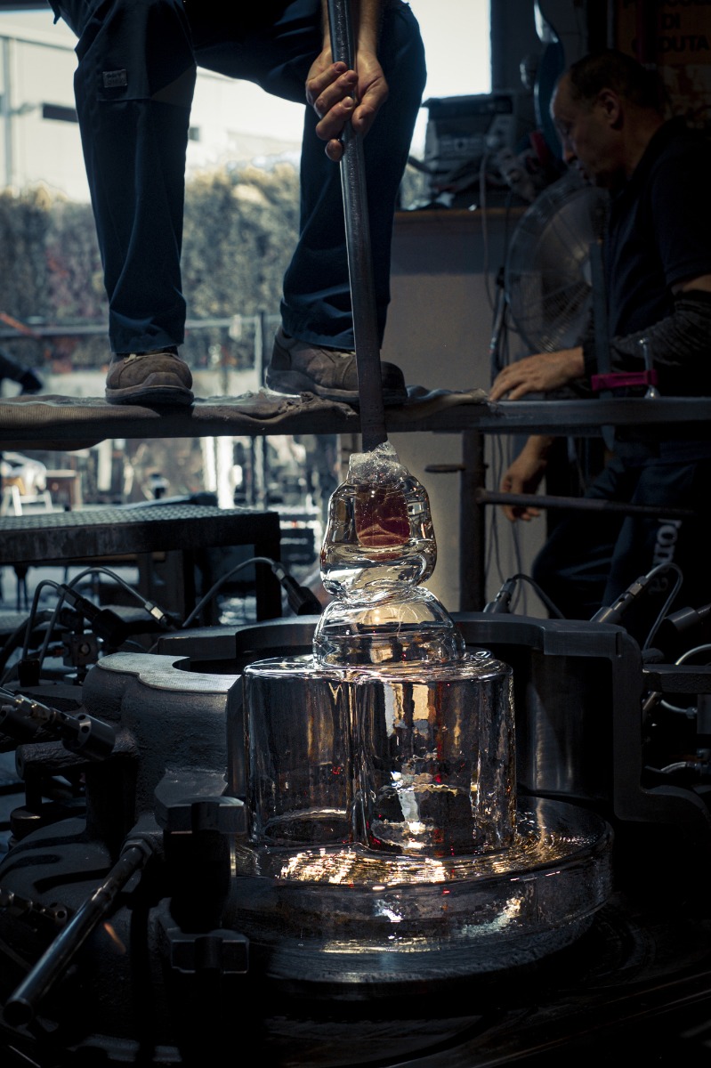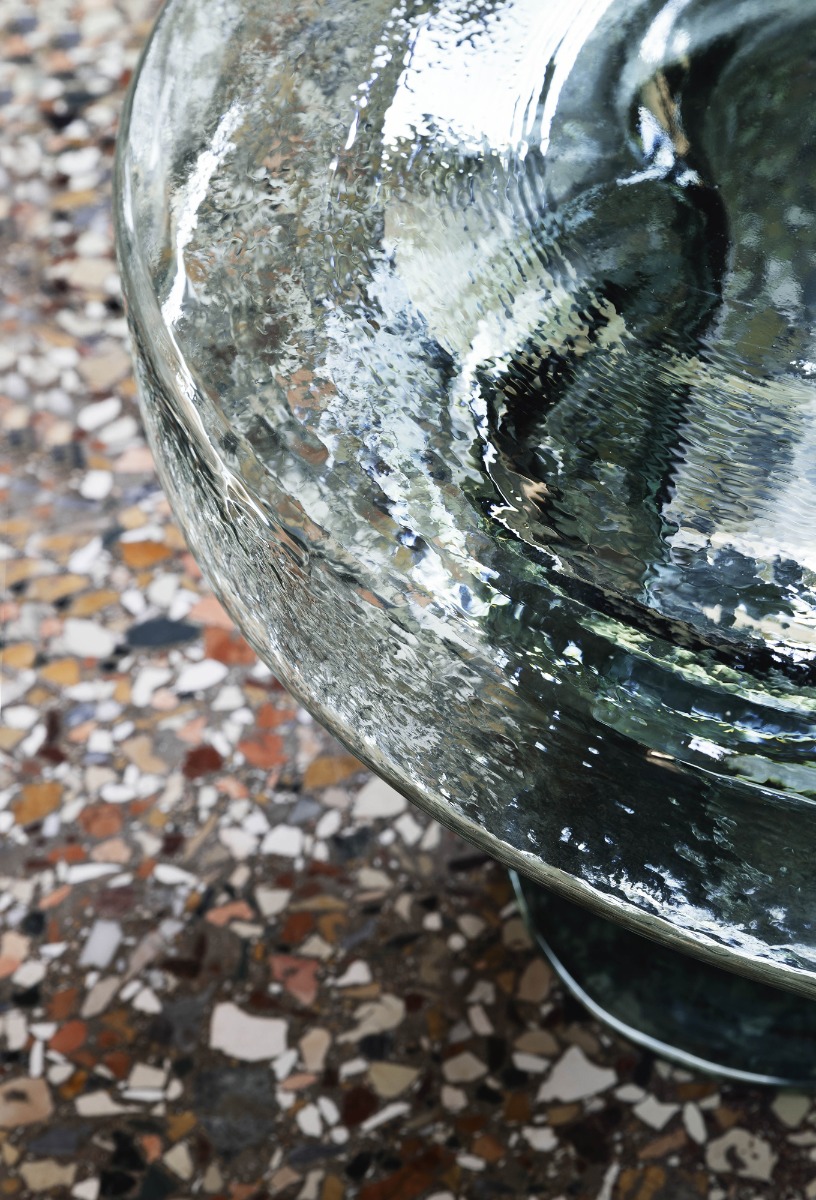 Soda was born upside-down, with a puff of air. It weighs 20 kilos, and it is blown, drawn out and shaped by three master glassmakers. The result is a single volume of glass with three large petals forming the stem. In Soda, the glass vibrates: its tough, hammered surface fragments its transparency to give a primitive aesthetic. This is artistic value granted to an industrial product.