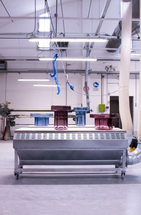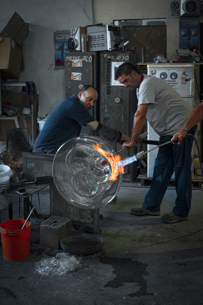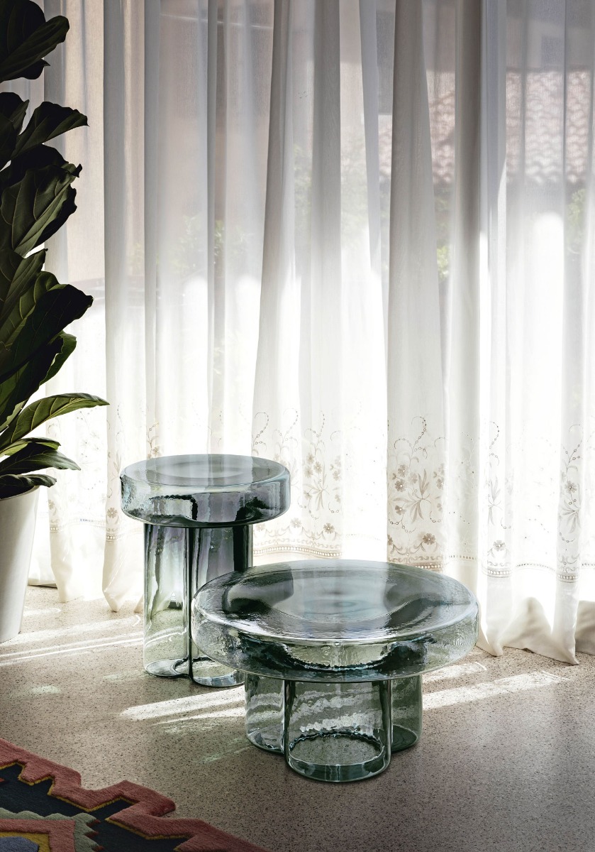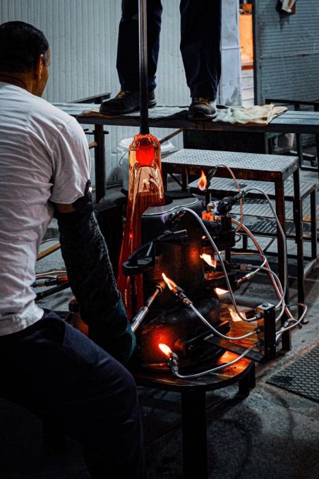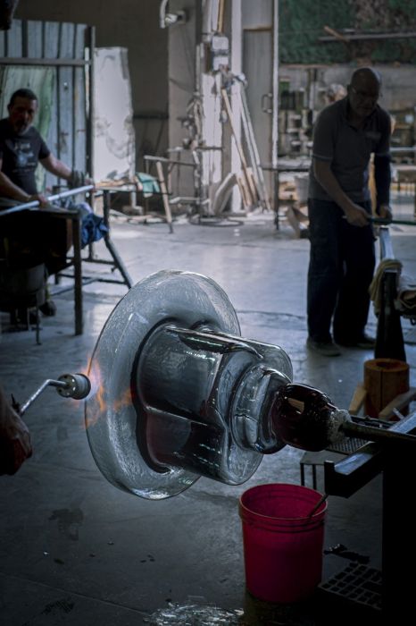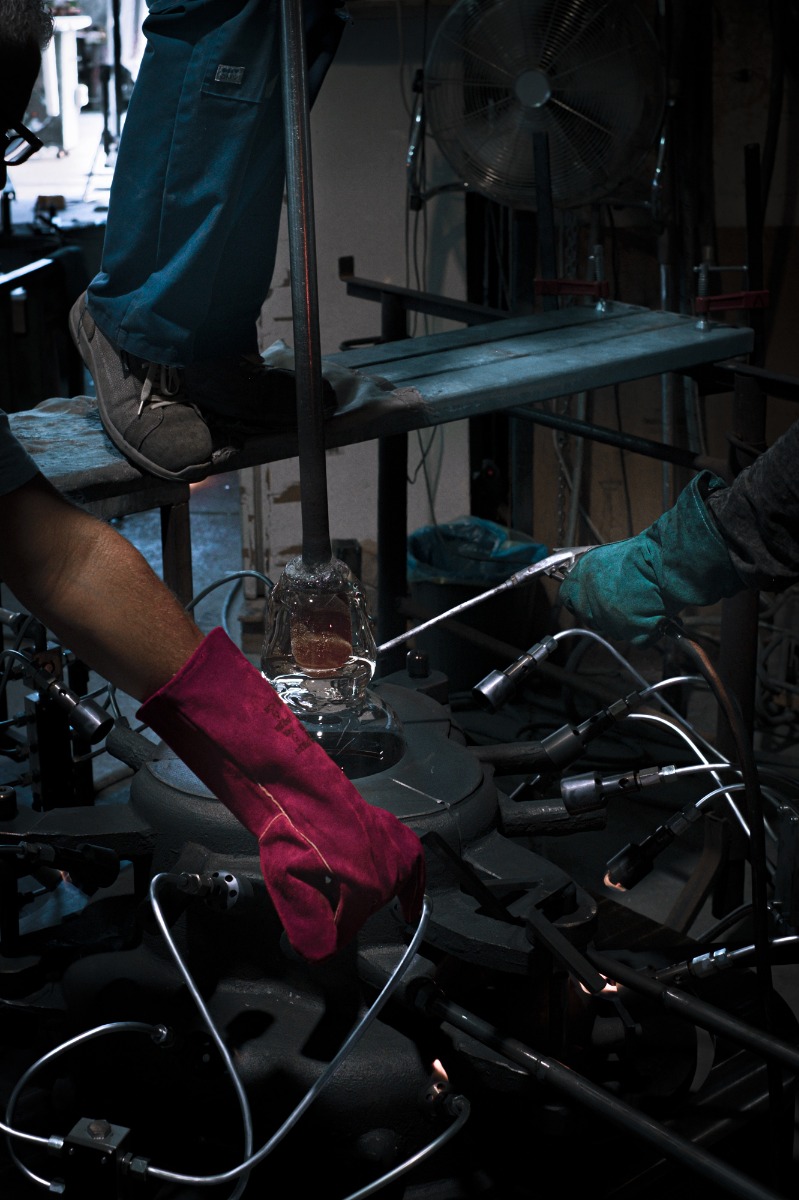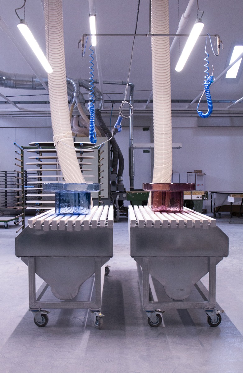 Soda was born upside-down, with a puff of air. It weighs 20 kilos, and it is blown, drawn out and shaped by three master glassmakers. The result is a single volume of glass with three large petals forming the stem. In Soda, the glass vibrates: its tough, hammered surface fragments its transparency to give a primitive aesthetic. This is artistic value granted to an industrial product.