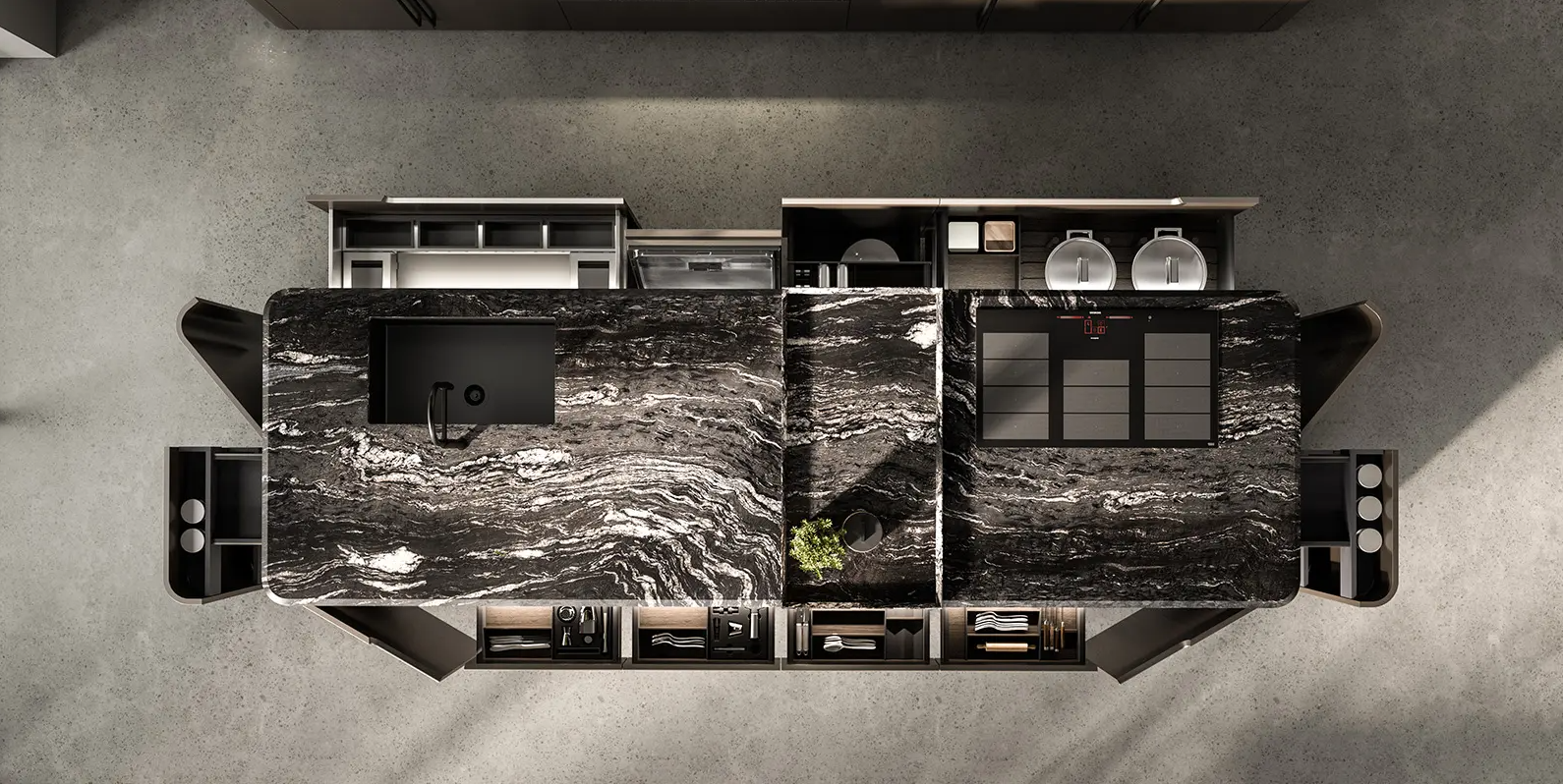 Curve armoniose su basi, pensili e colonne per un effetto fluido e accogliente. I cestoni curvi estraibili dei terminali massimizzano lo spazio senza sprechi, mentre vani apribili e colonne con ante curve sono retroilluminati per un effetto elegante. I vani a giorno curvi e gli elementi contenitivi integrati nelle forme completano un progetto che ridefinisce gli spazi con stile e funzionalità.