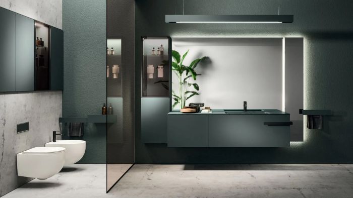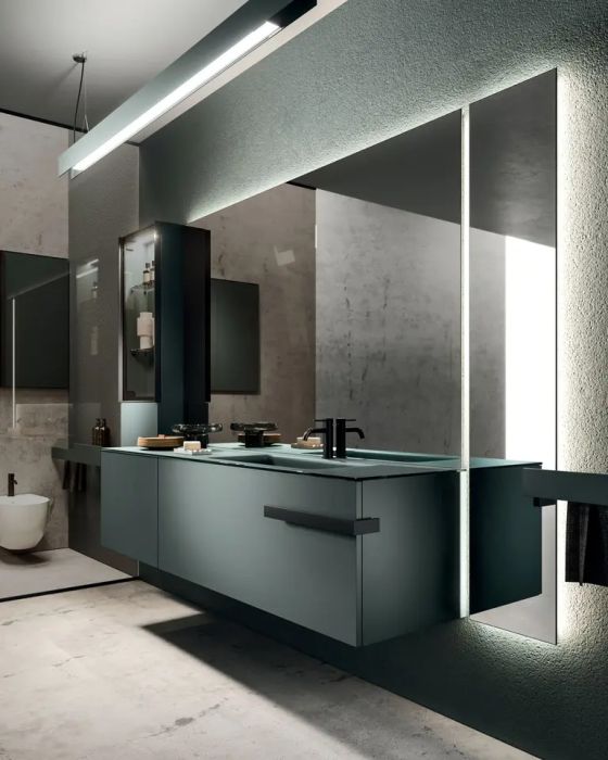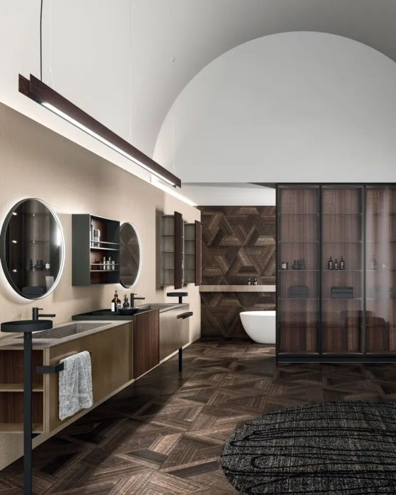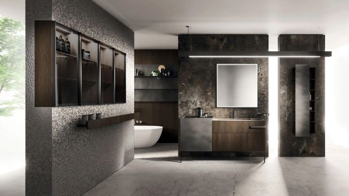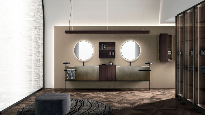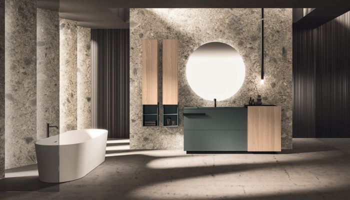 La collezione si distingue per soluzioni progettuali esclusive, come il modulo terminale estraibile che consente l'accesso a doppio vano contenitivo con un unico movimento. Ogni dettaglio, dagli accessori integrati ai sistemi di illuminazione LED regolabili, è studiato per creare un'atmosfera coordinata e armoniosa. L'innovazione dei materiali e la cura meticolosa delle lavorazioni, come il particolare Rovere Terra Dogato con effetto 3D, conferiscono a Lympha una profondità tattile e visiva unica nel panorama dell'arredo bagno.