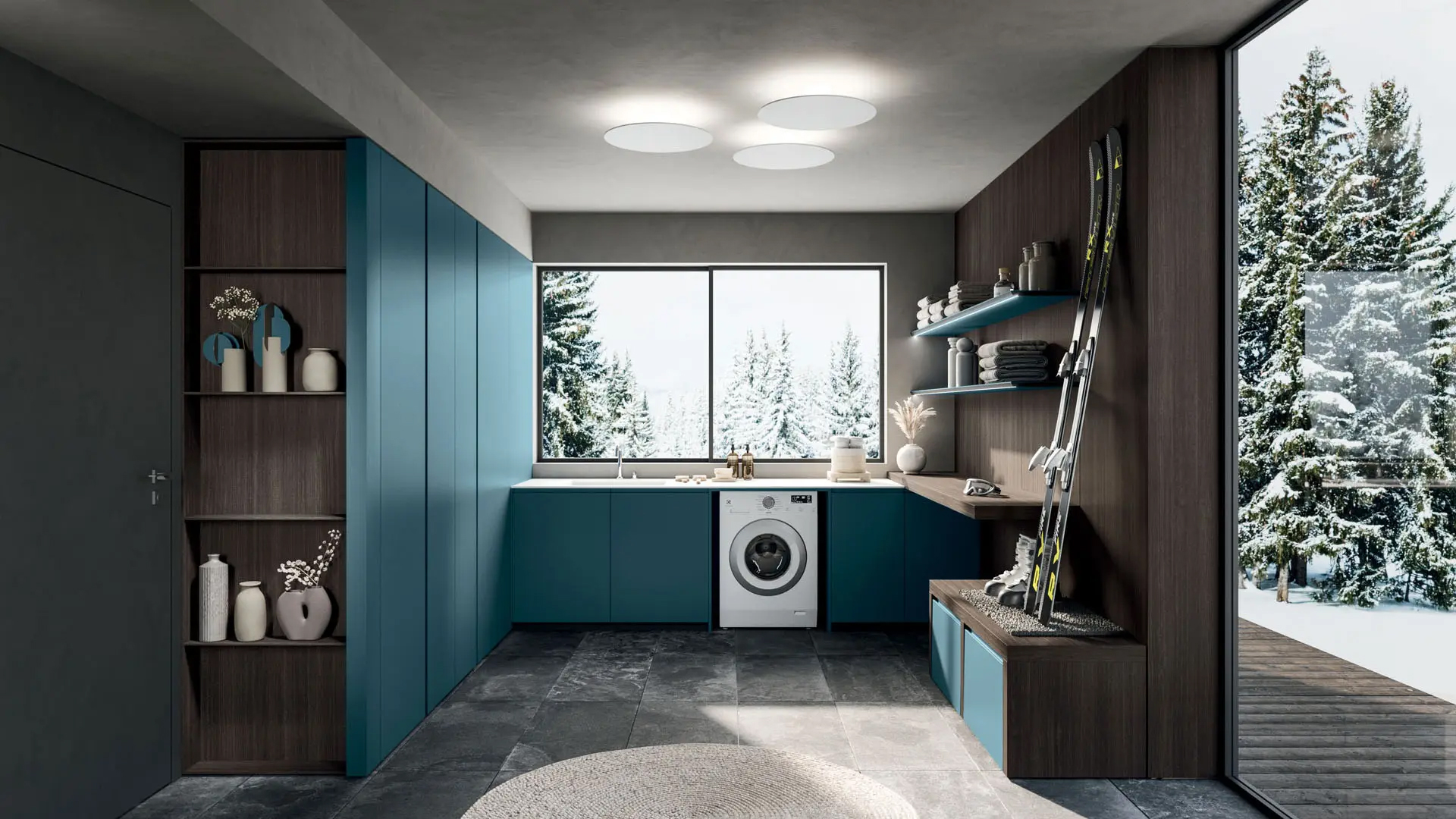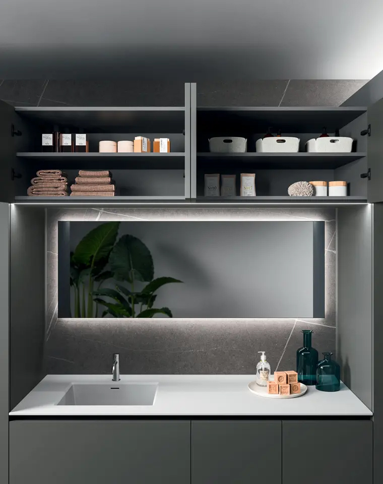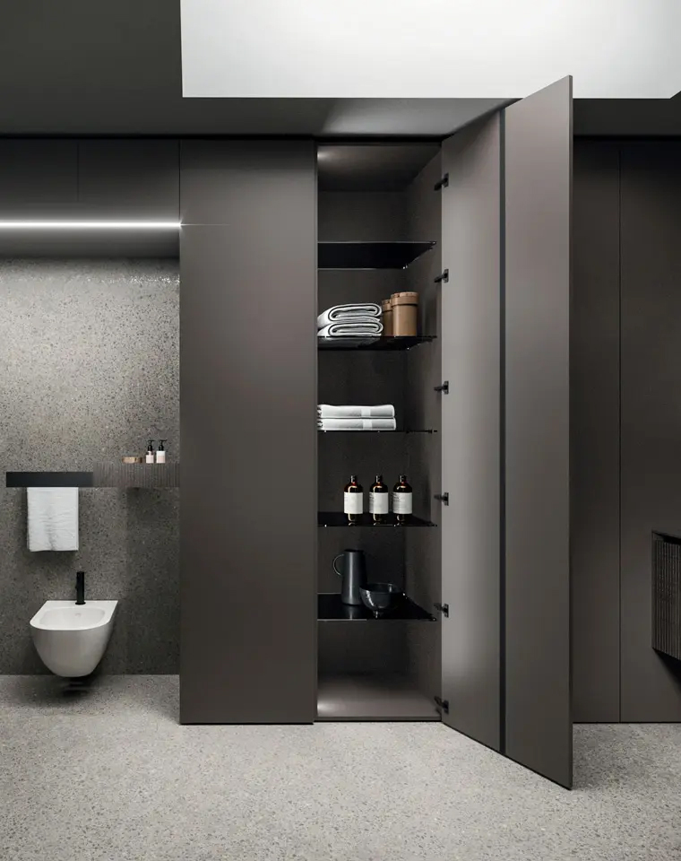 Il sistema risponde con soluzioni concrete alle esigenze di contenimento e operatività: dalle colonne attrezzate per lavatrice e asciugatrice ai moduli portascarpe con piani estraibili, fino ai lavatoi integrati di grandi dimensioni. Ogni elemento è studiato per resistere all'uso intensivo grazie a materiali tecnici ad alte prestazioni, senza mai rinunciare alla raffinatezza del design firmato Franco Driusso. La modularità versatile permette di creare configurazioni su misura, dai bagni padronali multifunzionali alle utility room indipendenti.