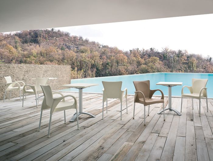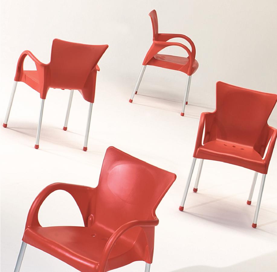 Sedia dalle forme morbide, impilabile (max 5 pezzi), resistente alle intemperie esterne e disponibile in una vasta gamma di colori.