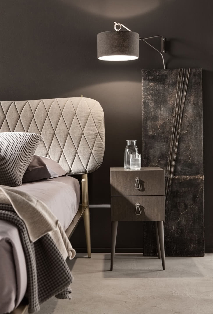City comodino a due cassetti a richiamo frenato, si distingue per la sua perfetta forma cubica e i lunghi gambi conificati in metallo
