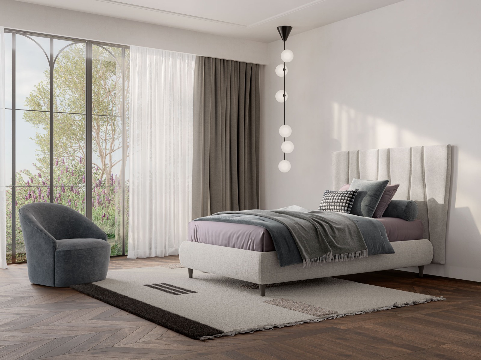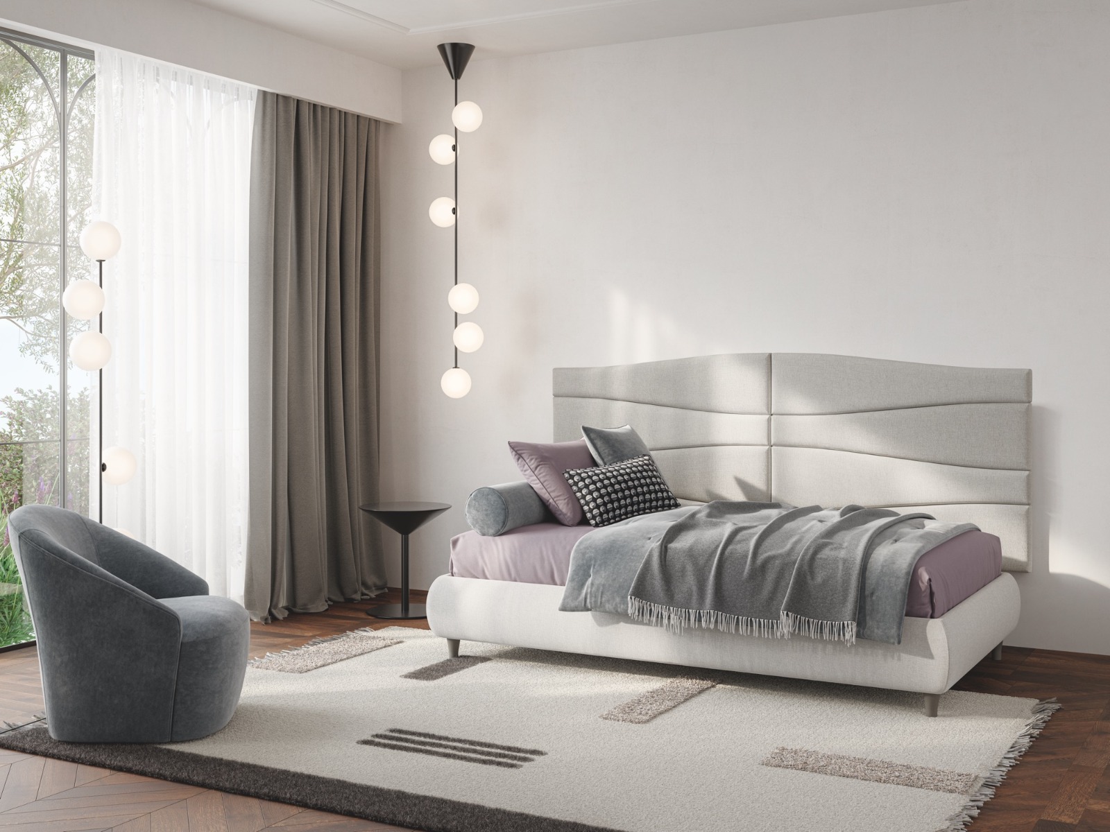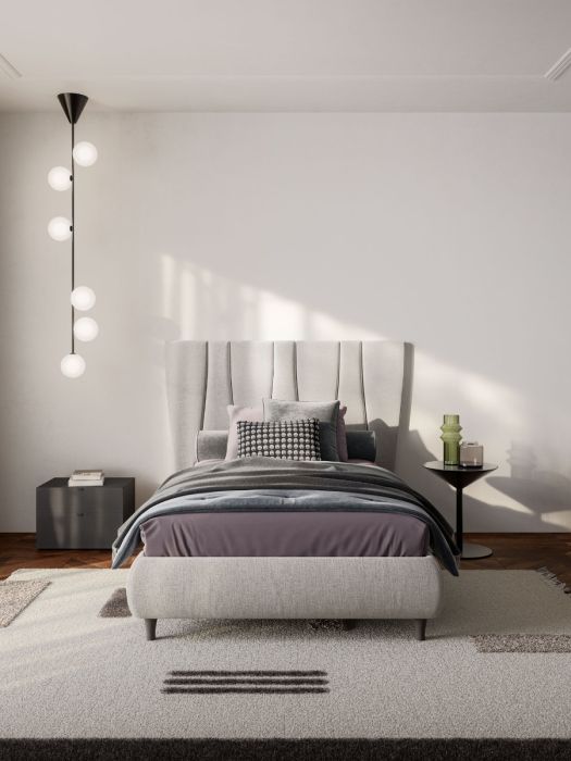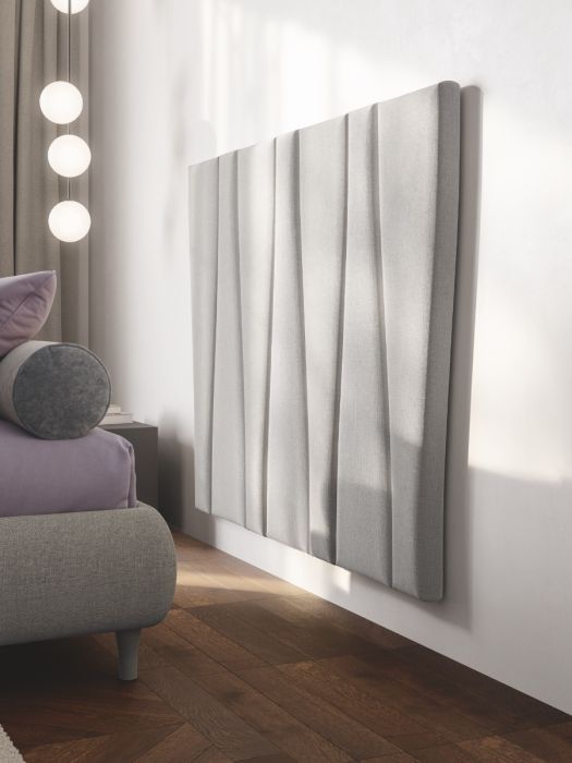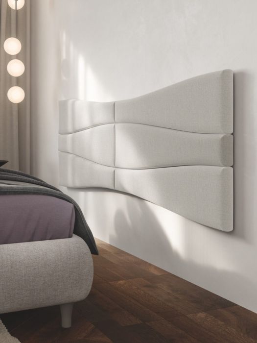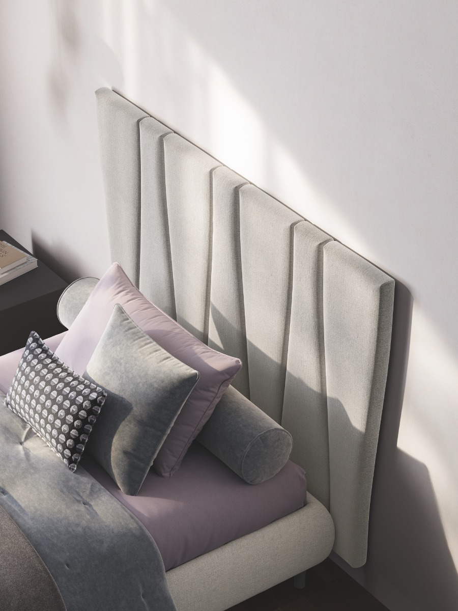Una boiserie che introduce un elemento di movimento sulla superficie morbida dell’appoggio a parete. Un modo per scegliere un classico sommier e rendere comunque lo spazio notte un luogo sofisticato.