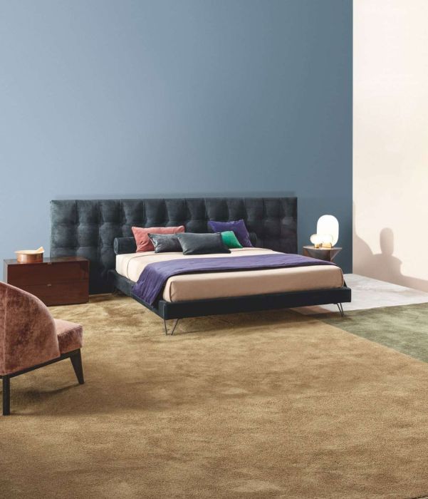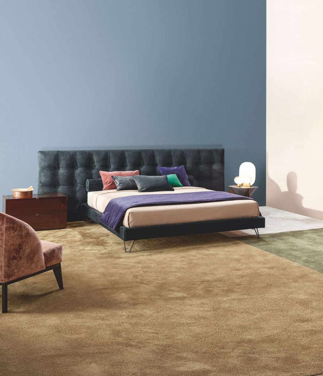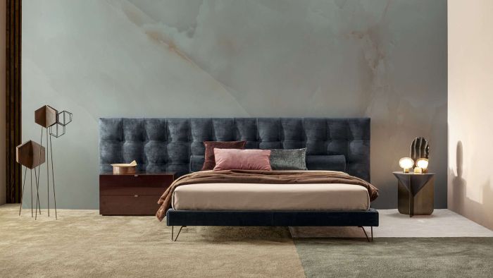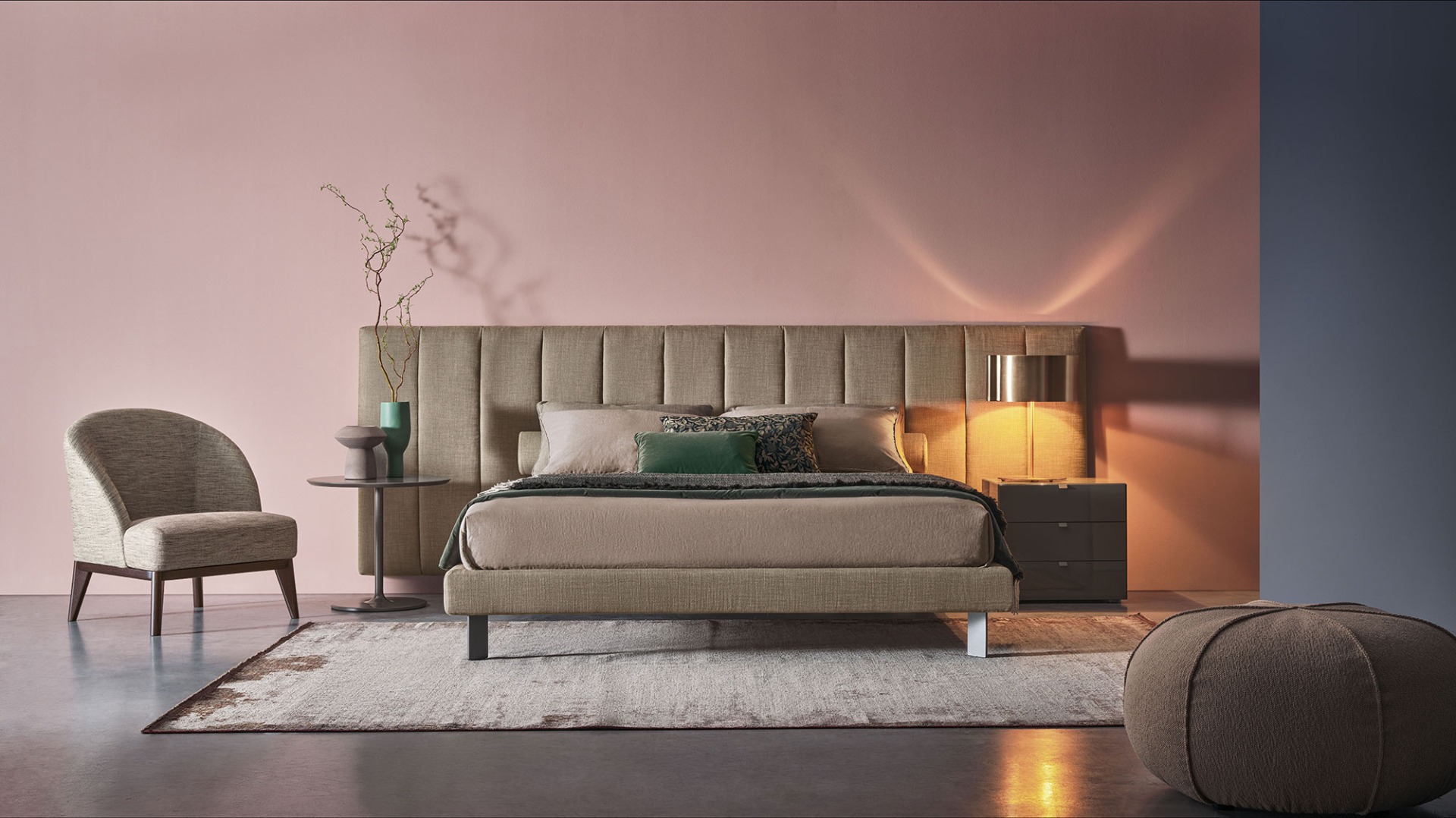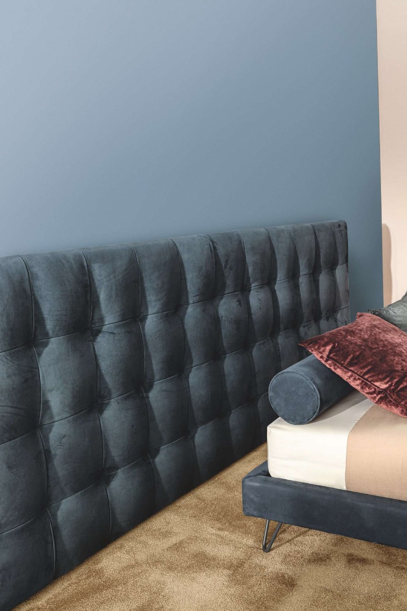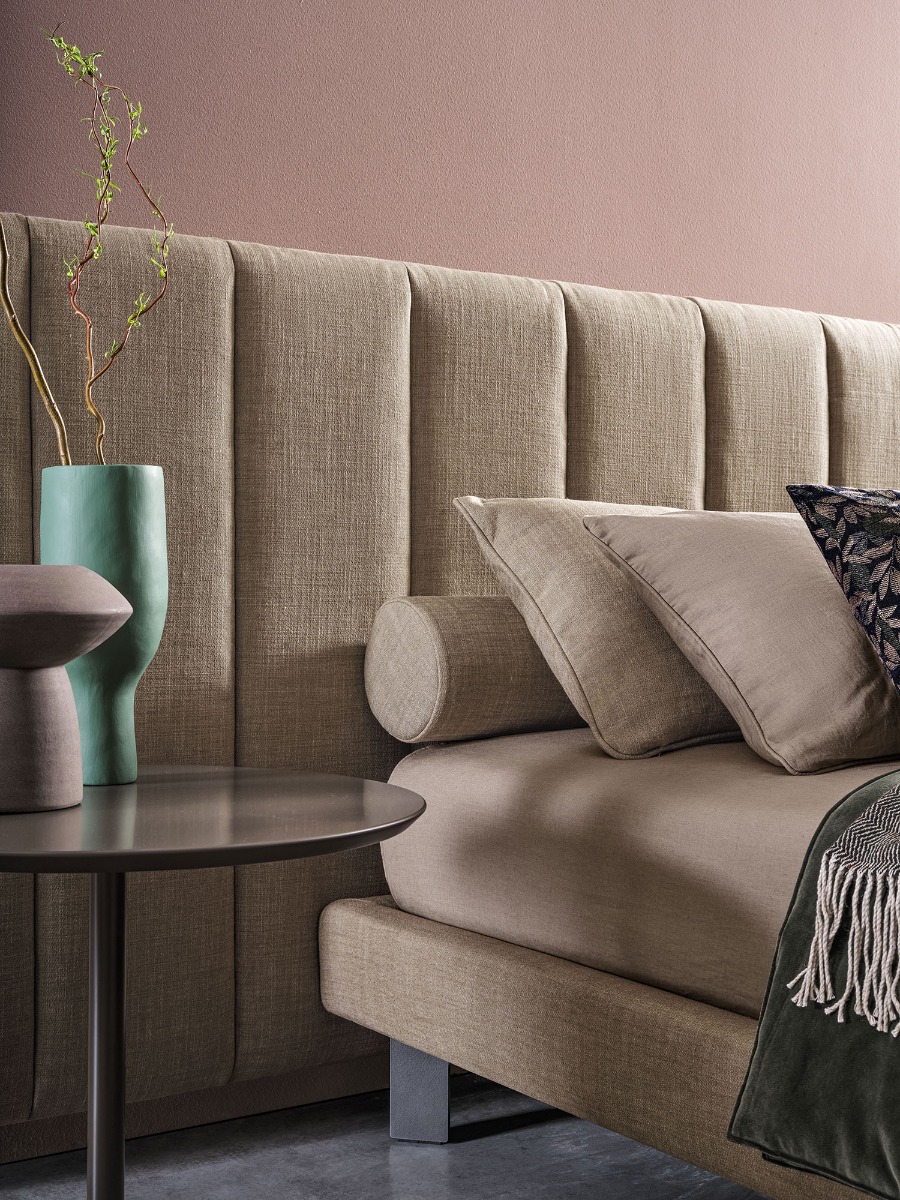 Una parete che diventa una testiera ampia e morbida, essenziale nel decoro. Le impunture verticali creano un pattern grafico regolare, pulito e focalizzano l’attenzione sulla rilassante ritmicità della superficie.