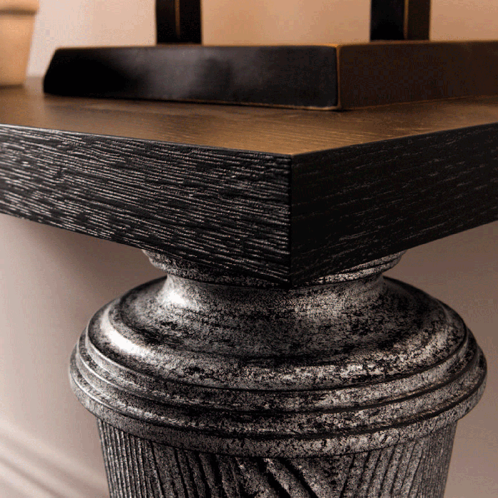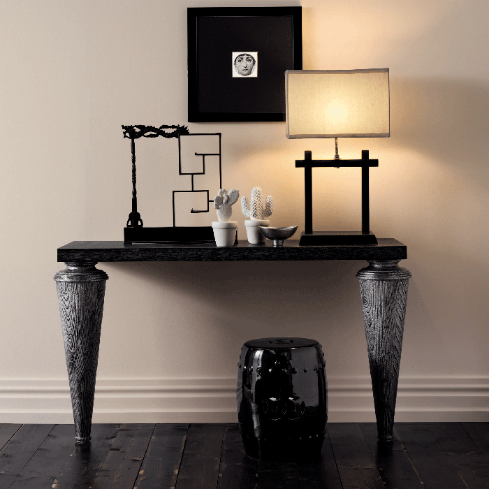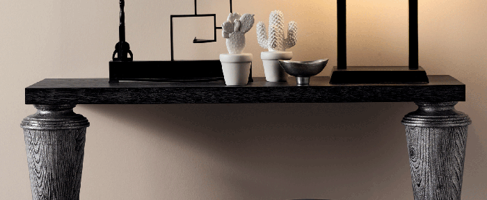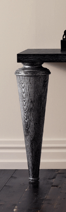 Elegante consolle con piano in rovere sabbiato e gambe in legno tornito sabbiato.