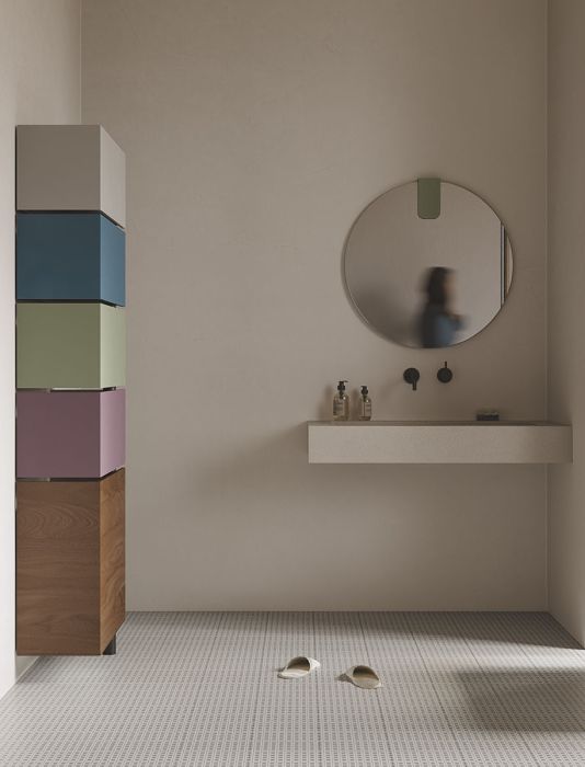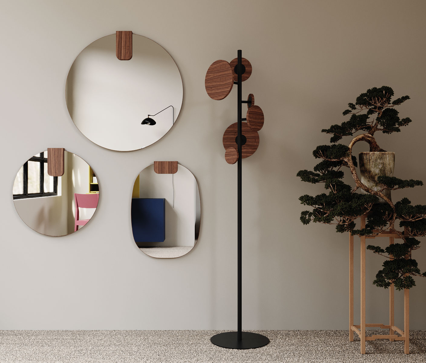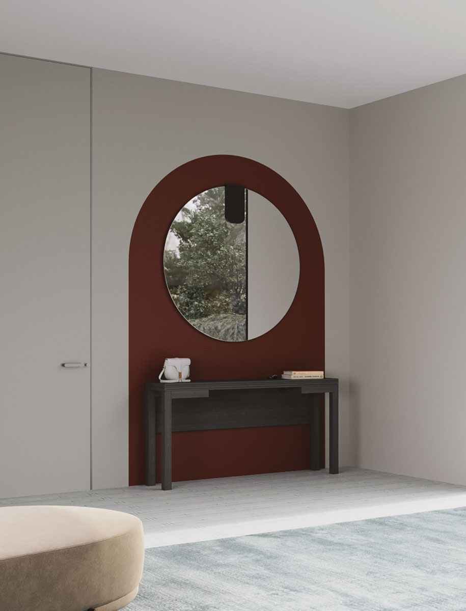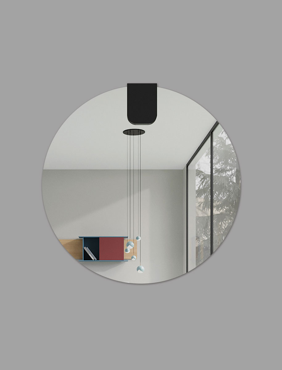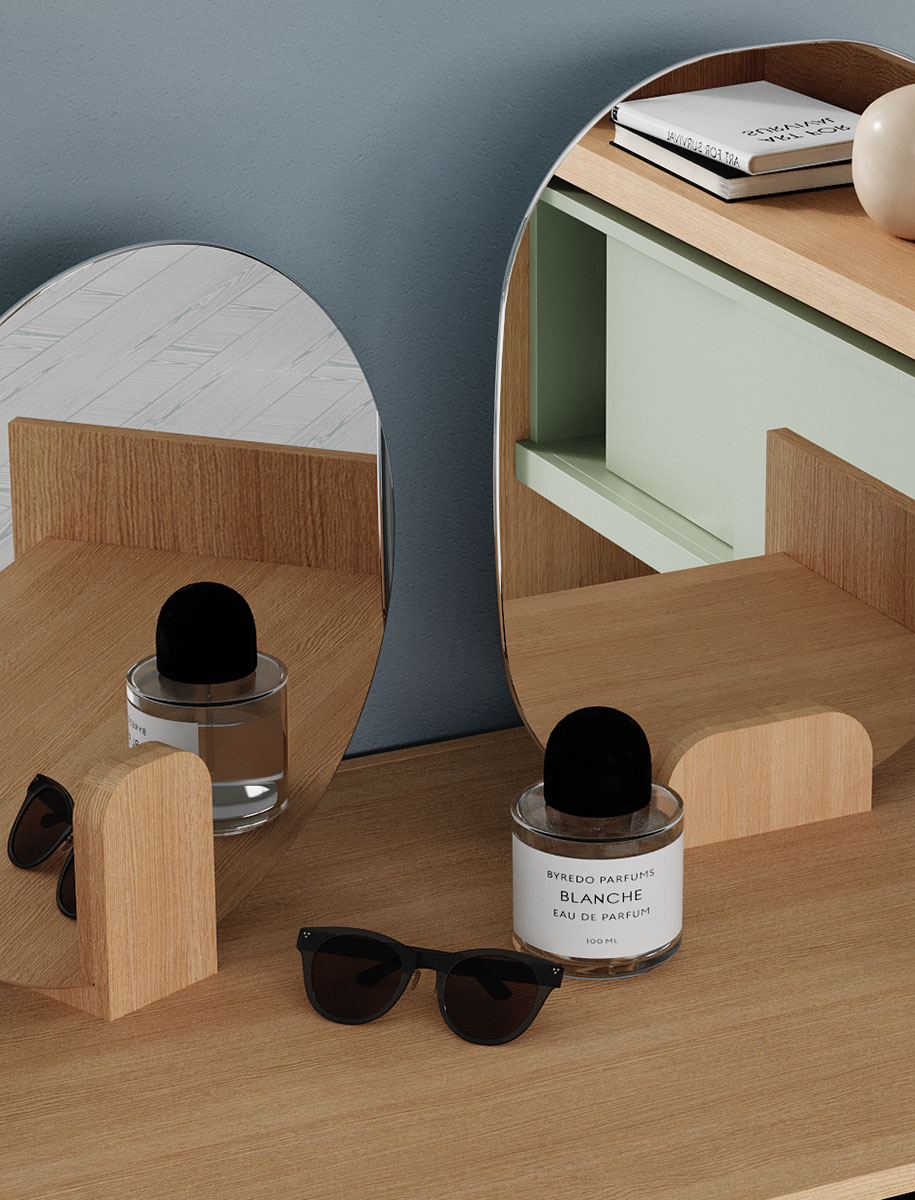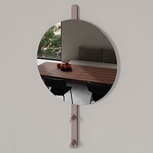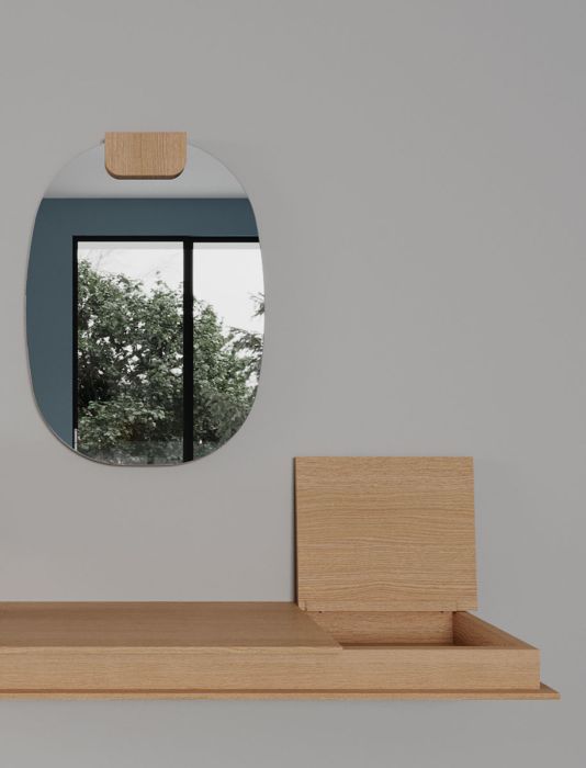 Famiglia di specchi da parete disponibile in due forme (tondo e ovale) e in sei dimensioni. Sono caratterizzati da un elemento di supporto in Tranciato (legno) di V16 rovere, V18 rovere tinto grigio, V19 noce canaletto o in Touch (laccato). Il vetro colorato a specchio è disponibile in due colori: talpa e grigio.
