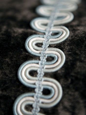 Uno stretto nastro curato in ogni dettaglio che presenta un cordoncino in tessuto con un bordo curvato dolcemente. 'Gimp' si riferisce alla parte centrale che ha un tessuto avvolto intorno per creare un forte effetto colore. È come un filo colorato che quindi può essere utilizzato all'interno dell'addobbo in vari modi per ottenere un effetto decorativo. Utilizzato per sedie, sgabelli, ecc. Come nastro per mantovane o per pareti. Cuscini, tende, tendaggi per letto, tovaglie, rivestimenti di porte.