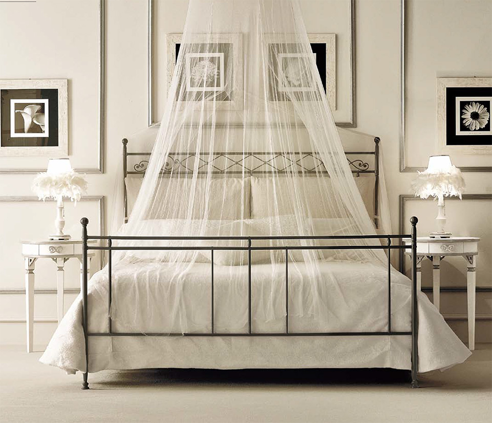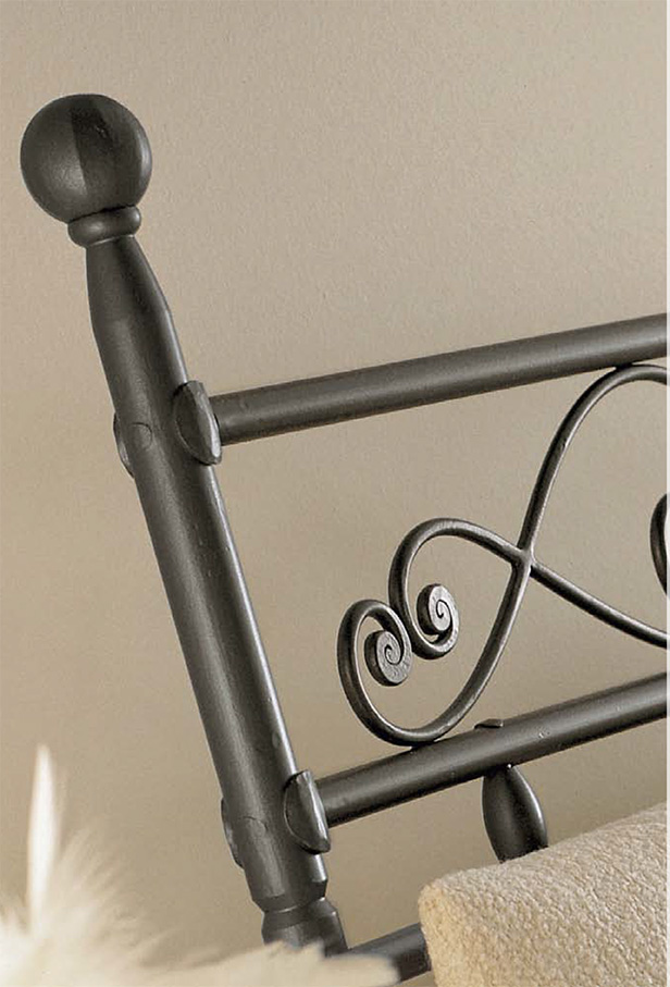Letto in ferro battuto con ampia testiera decorata con motivi squadrati e classici,per una camera da letto vintage ed elegante. Il letto Felipe è disponibile in diversi modelli.