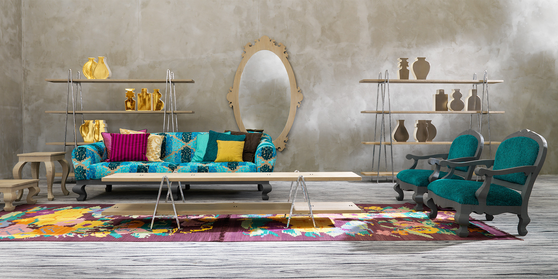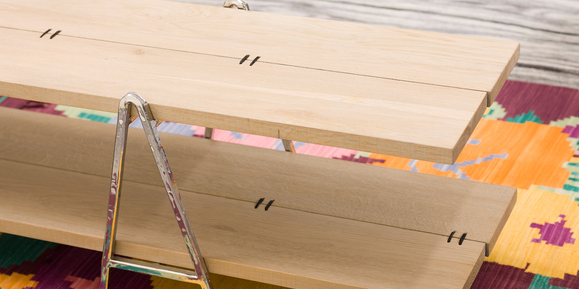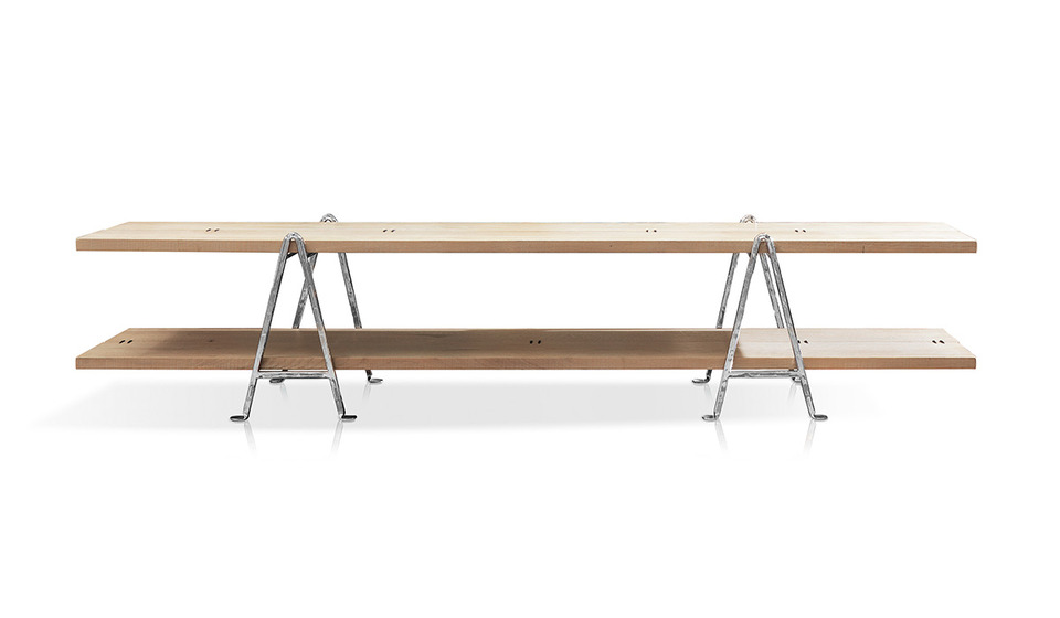 Porta TV con piani in rovere o larice massello sabbiato. Le assi dei piani sono legate con corda abacá e si appoggiano su cavalletti cromati o zincati. Disponibile in diverse finiture.