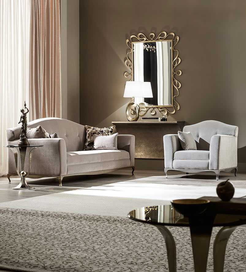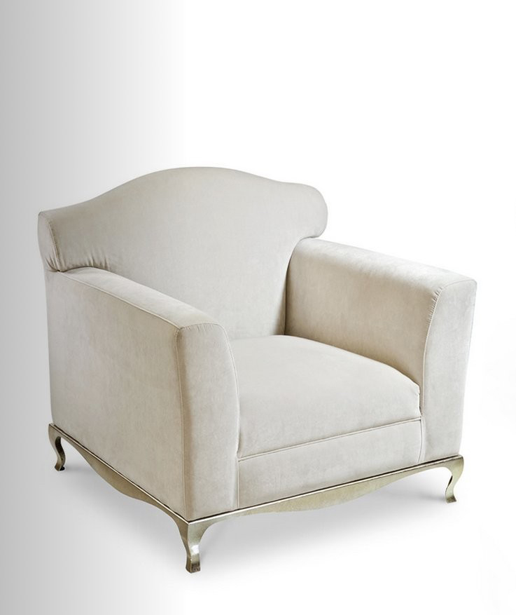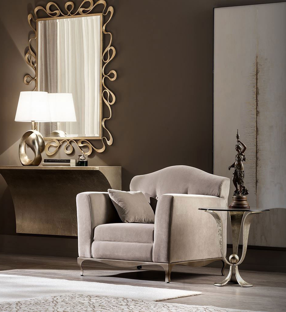 Poltrona vintage Ghirigori con base in ferro . Il telaio in metallo, tagliato a laser e curvato, unisce i piedi, decorati in foglia o in bronzo patinato. L'imbottitura è realizzata in gomma a tre densità mentre il rivestimento sartoriale è realizzabile in tessuto, velluto, pelle.