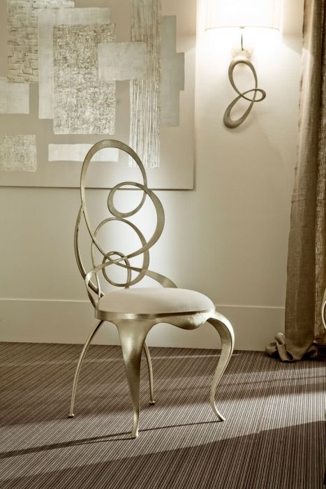 La decorazione asimmetrica, destra o sinistra, della spalliera e delle due gambe posteriori è in ferro trafilato, tagliato a laser e bombato a freddo. Le superfici e le saldature a filo sono interamente levigate a mano. Le gambe anteriori sono realizzate invece in pressofusione di alluminio. La finitura in foglia o in madreperla dell'intera struttura è realizzata a mano. La seduta è in legno imbottito in gomma e rivestito sartorialmente (non sfoderabile).